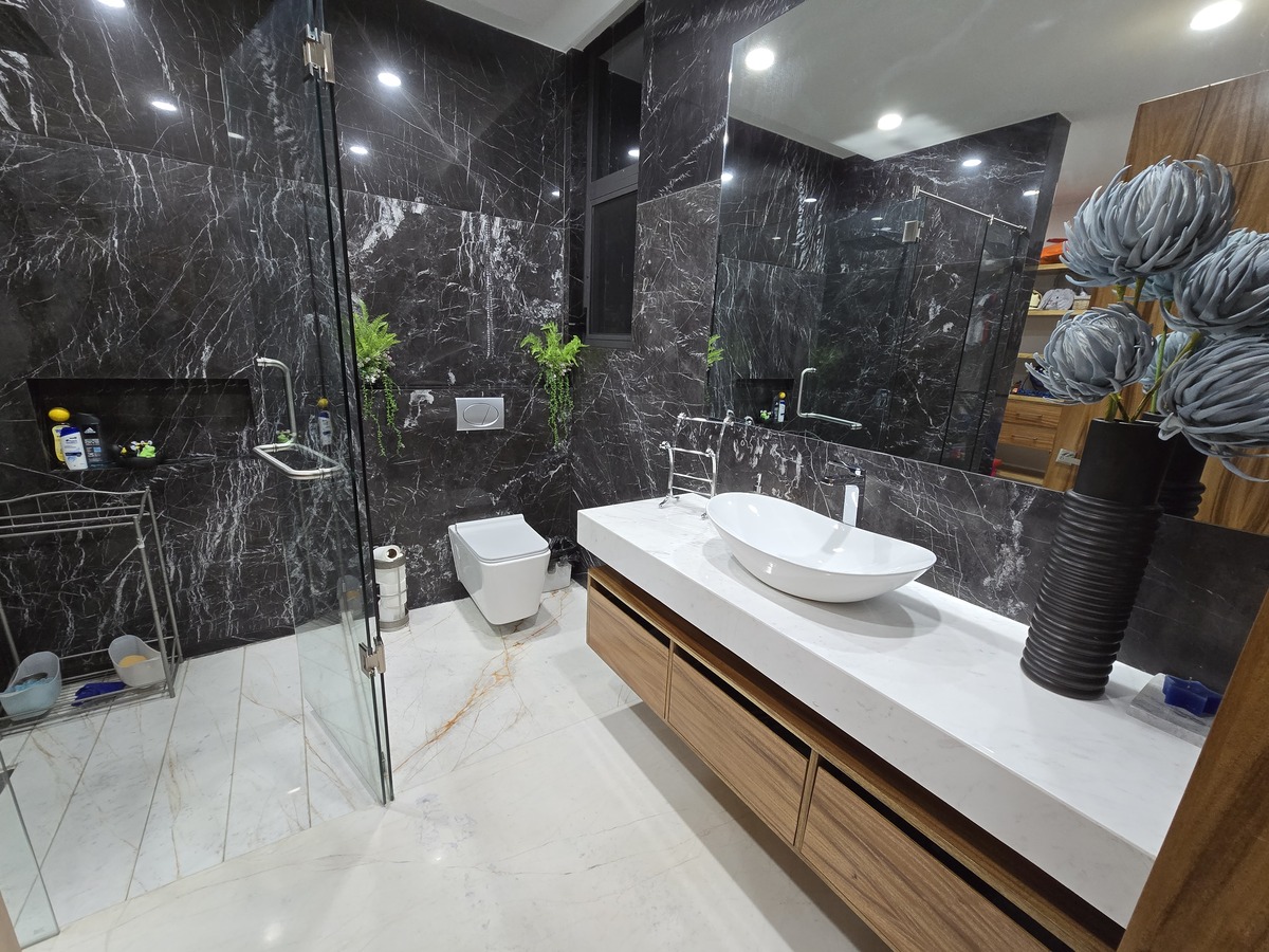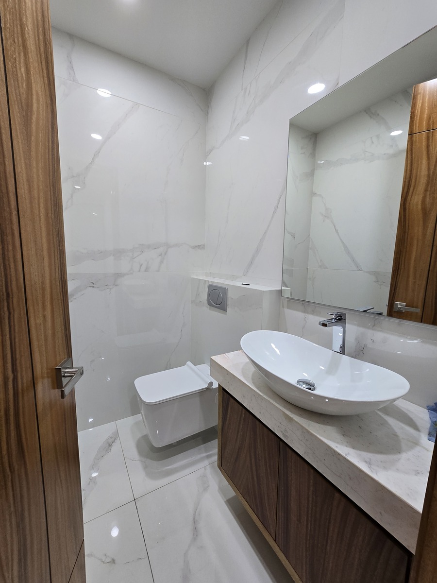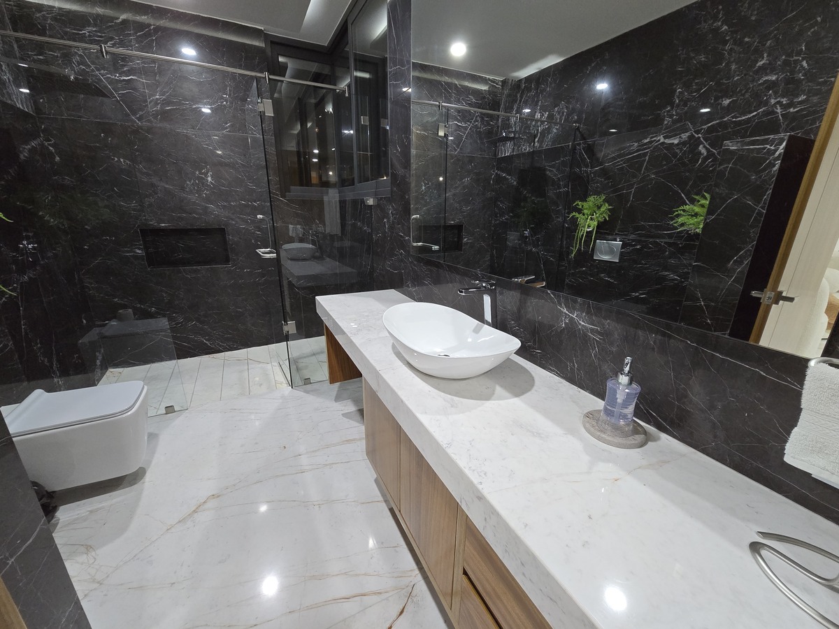 Una escalera de mármol negro con celosía de madera conduce a la planta alta, donde un pasillo con vista a la doble altura conecta las recámaras. Cada una cuenta con baño completo y vestidor, además de una atmósfera cálida y elegante. Este nivel también ofrece una acogedora sala de TV ideal para momentos familiares.