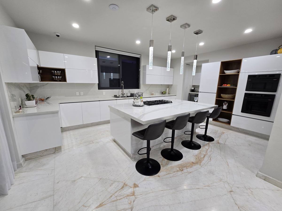 The double-height social area is the heart of the house: living and dining room with a minimalist gas fireplace, suspended chandeliers, and large windows that connect to the terrace and pool. The fully equipped kitchen includes a granite bar, coffee break area, and pantry, perfectly integrating with the social area.