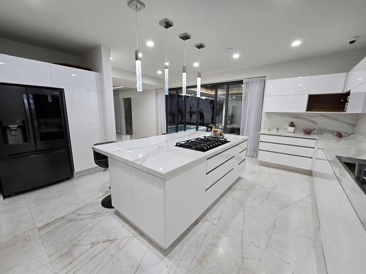 El área social en doble altura es el corazón de la casa: sala y comedor con chimenea minimalista de gas, candiles suspendidos y ventanales que conectan con la terraza y la alberca. La cocina, completamente equipada, incluye barra de granito, área de coffee break y alacena, integrándose perfectamente con el área social.