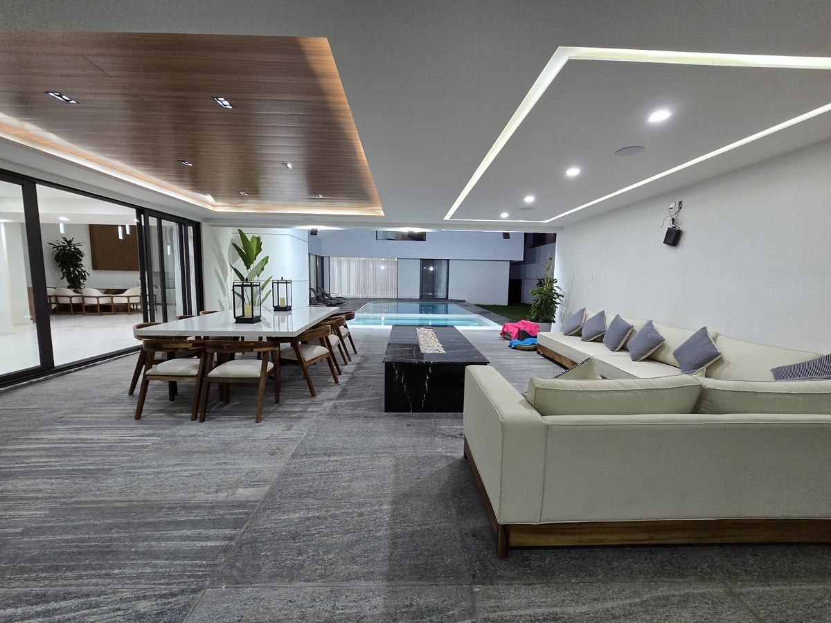Desde su imponente fachada, la casa se distingue por su arquitectura contemporánea, líneas limpias, materiales naturales y ventanales que integran la luz y la naturaleza al interior. Al ingresar, un amplio recibidor con vista directa a la alberca transmite amplitud y serenidad desde el primer instante.