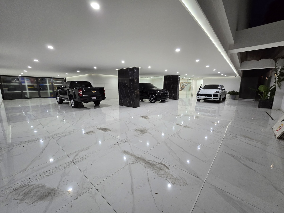 Pensado para el confort, el sótano cuenta con distribuidor, elevador y estacionamiento techado para ocho vehículos con acceso directo al interior. Aquí se encuentra una sala de cine con barra de bar, cuarto de servicio con baño, área de lavado, patio de servicio y bodega.