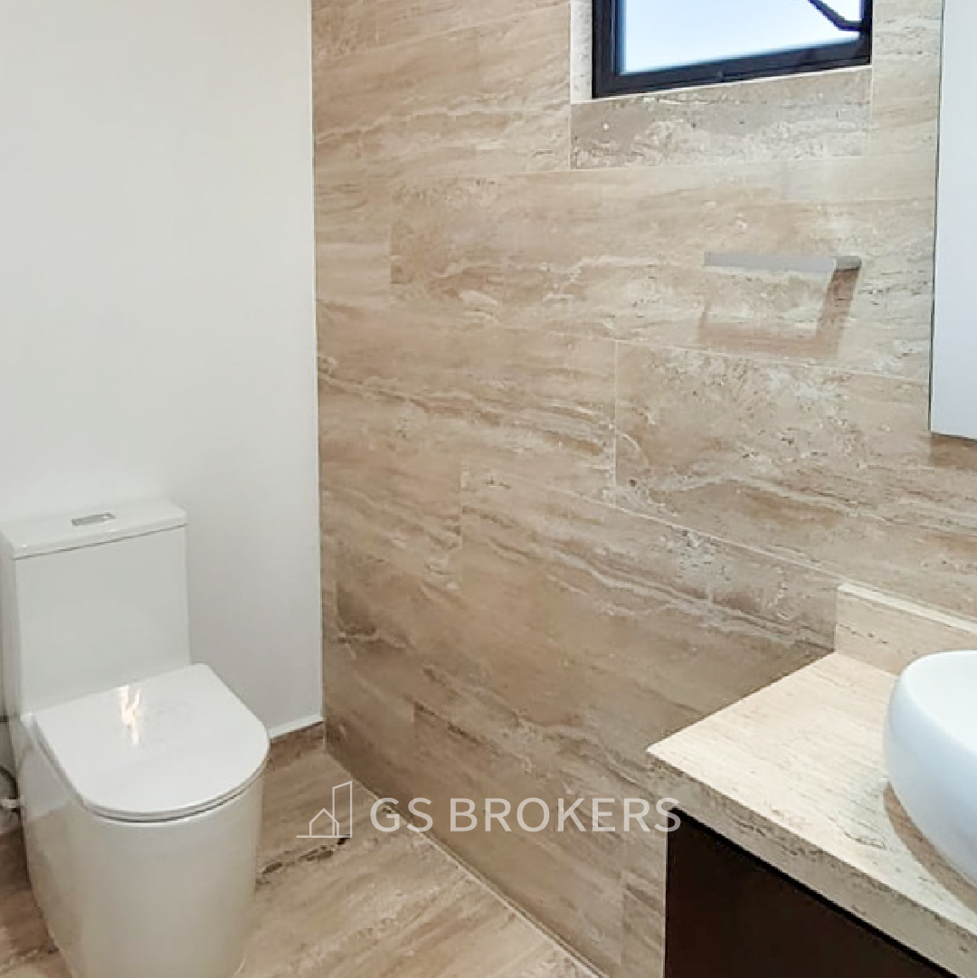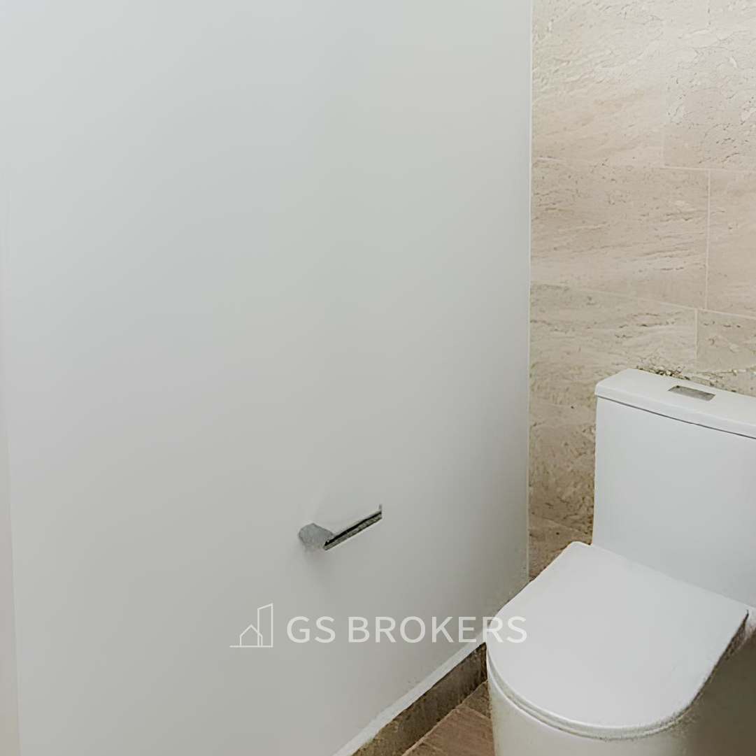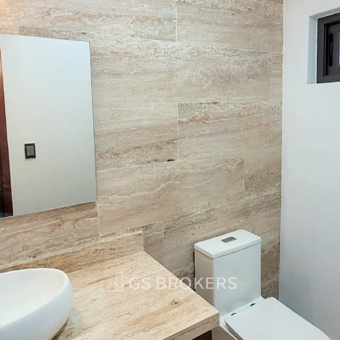 En planta baja cuenta con cochera para dos autos, recámara con baño completo, sala y comedor con excelente iluminación natural, cocina integral totalmente equipada y de lujo, terraza techada ideal para reuniones, cuarto de servicio con baño completo, área de lavado y un espacio independiente que puede funcionar como salón de juegos o loft con baño completo.