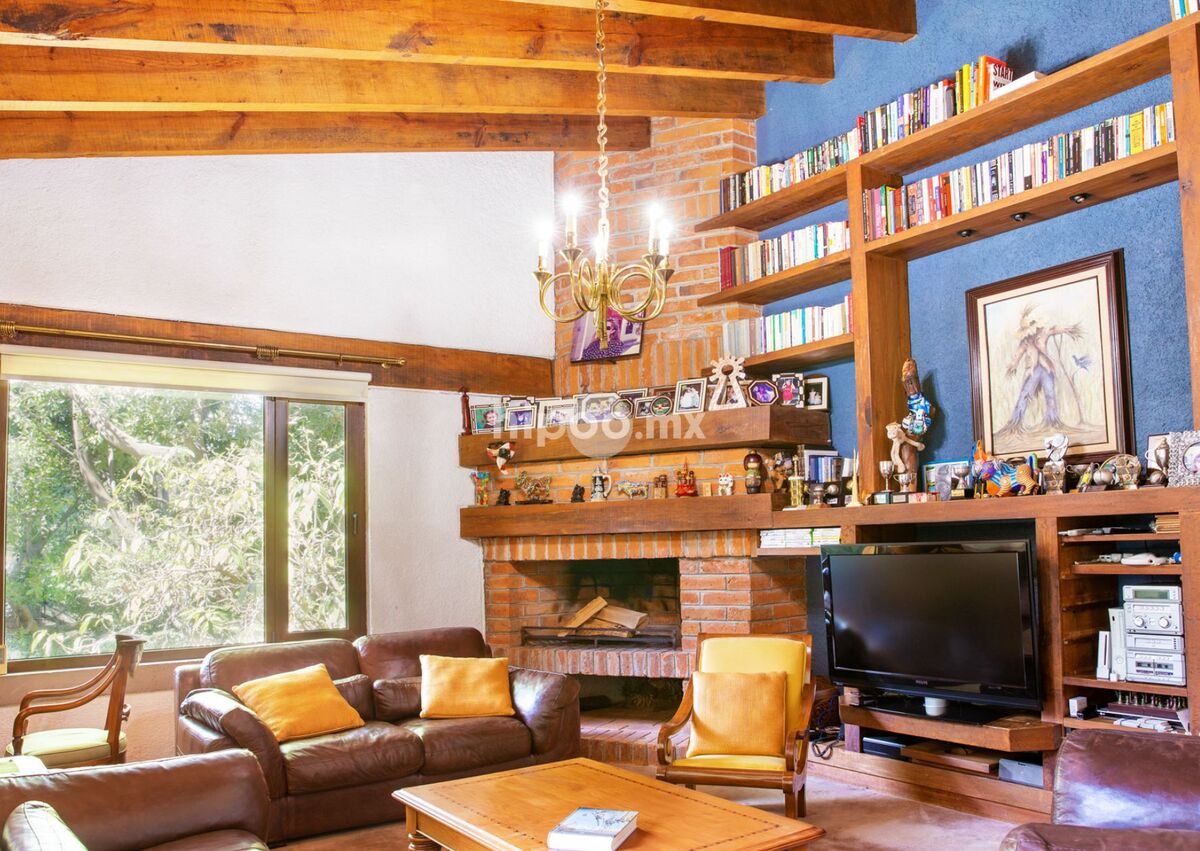 • Family room con chimenea y librero de madera de piso a techo.
