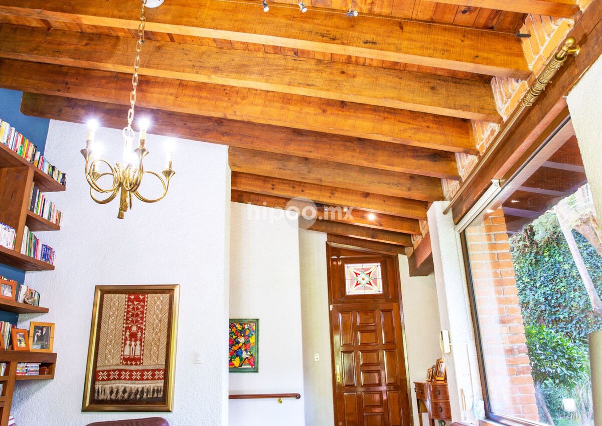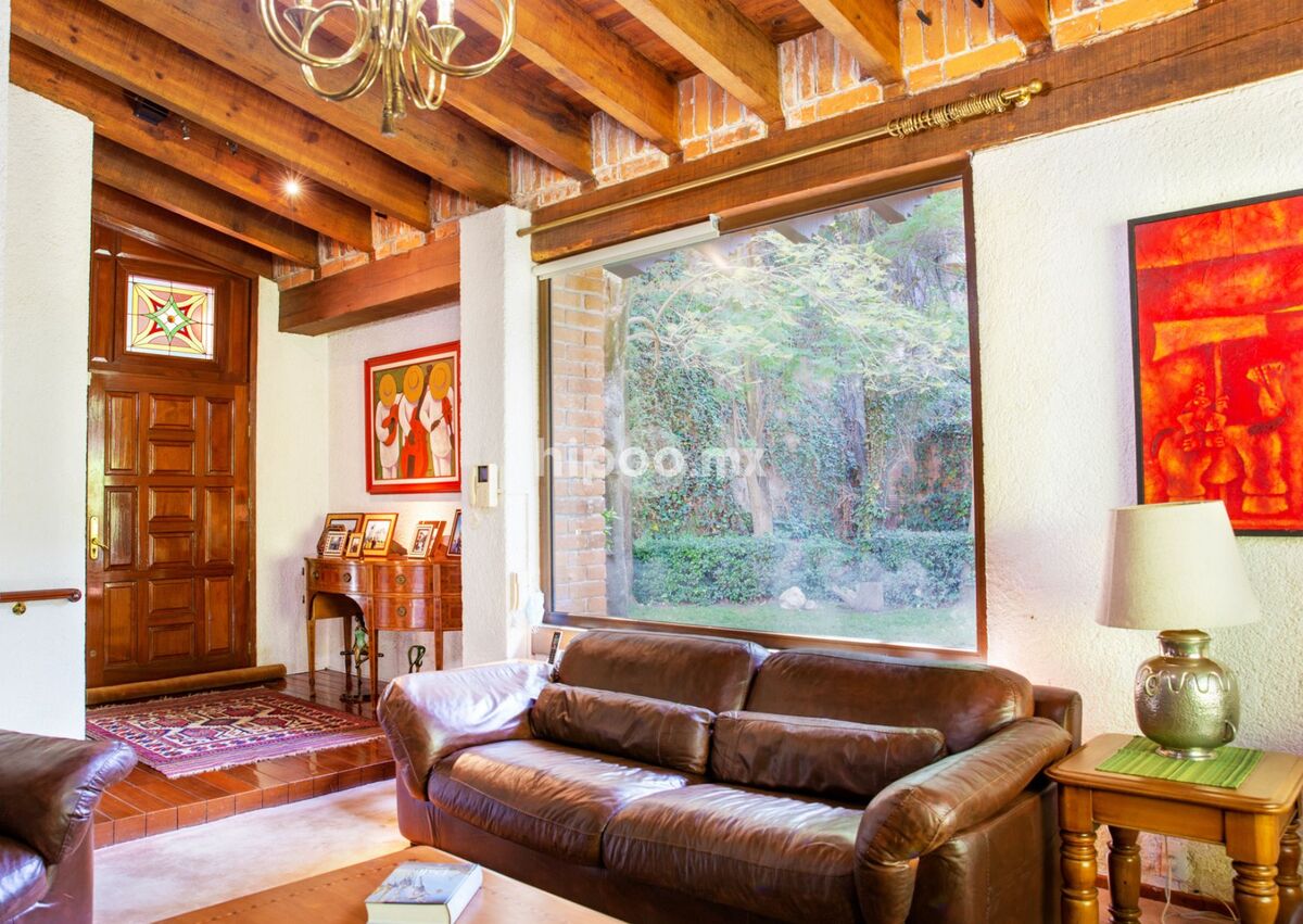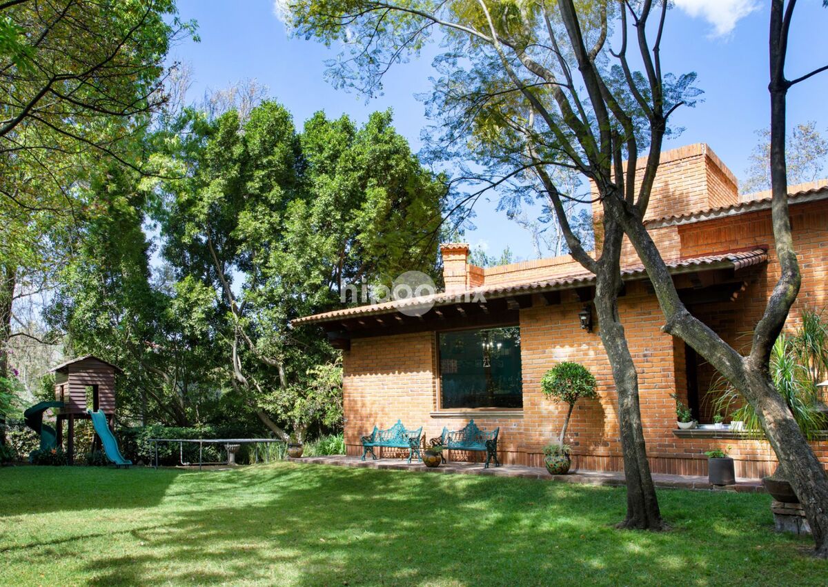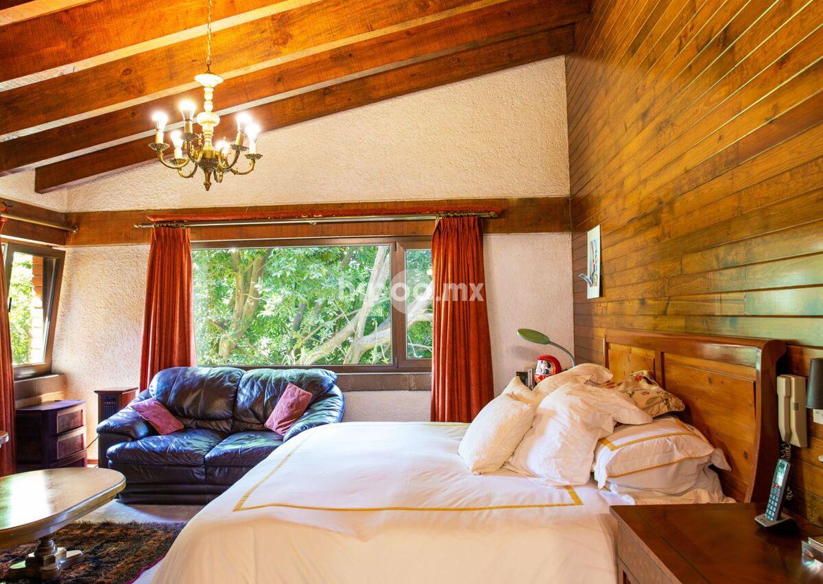 Diseñada al estilo del reconocido Arq. Almazán, esta residencia combina elegancia y calidez. Su fachada de ladrillo se integra perfectamente con los amplios jardines que rodean la propiedad, mientras que los interiores destacan por sus pisos, techos y muros de madera, todos con finos acabados artesanales.