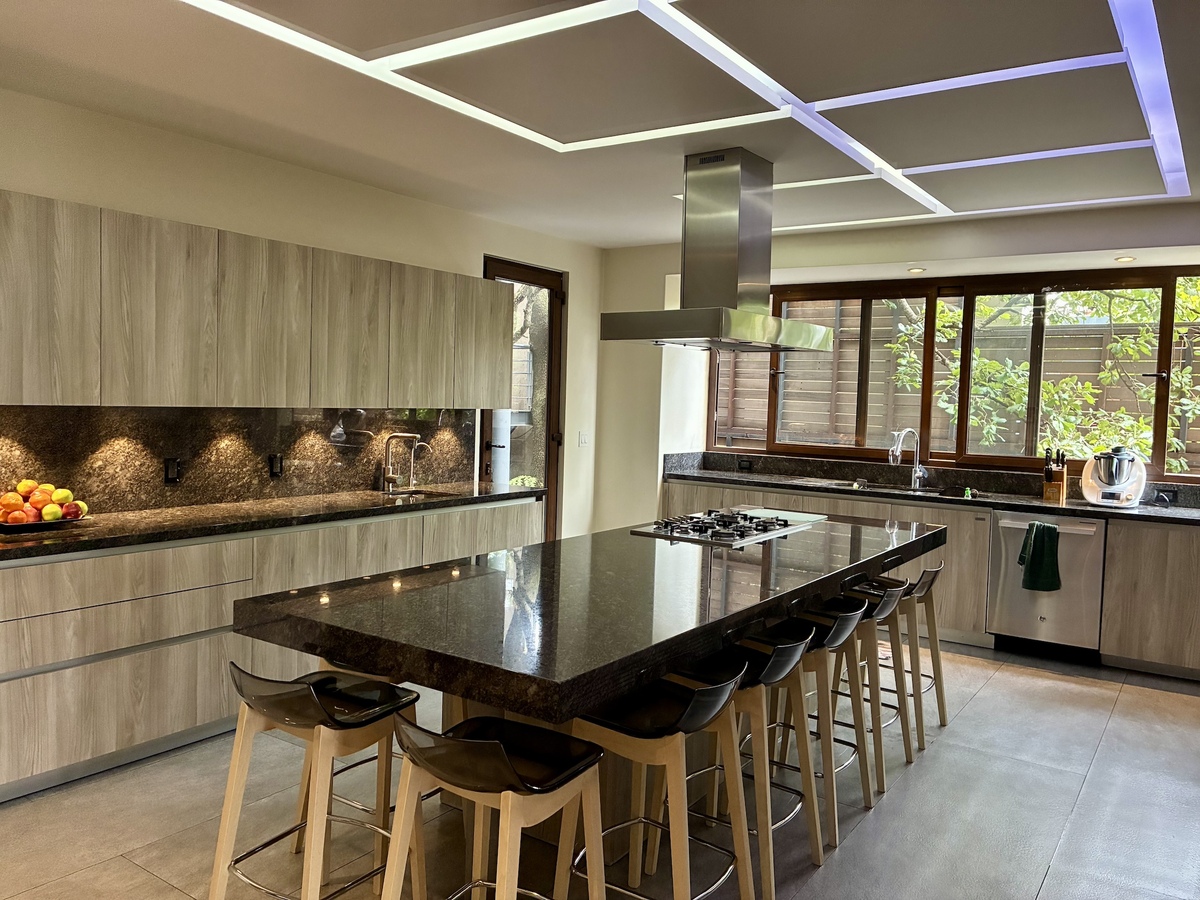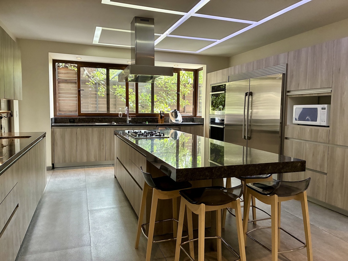 – Cocina equipada con isla, hornos eléctrico y de gas, refrigerador y congelador