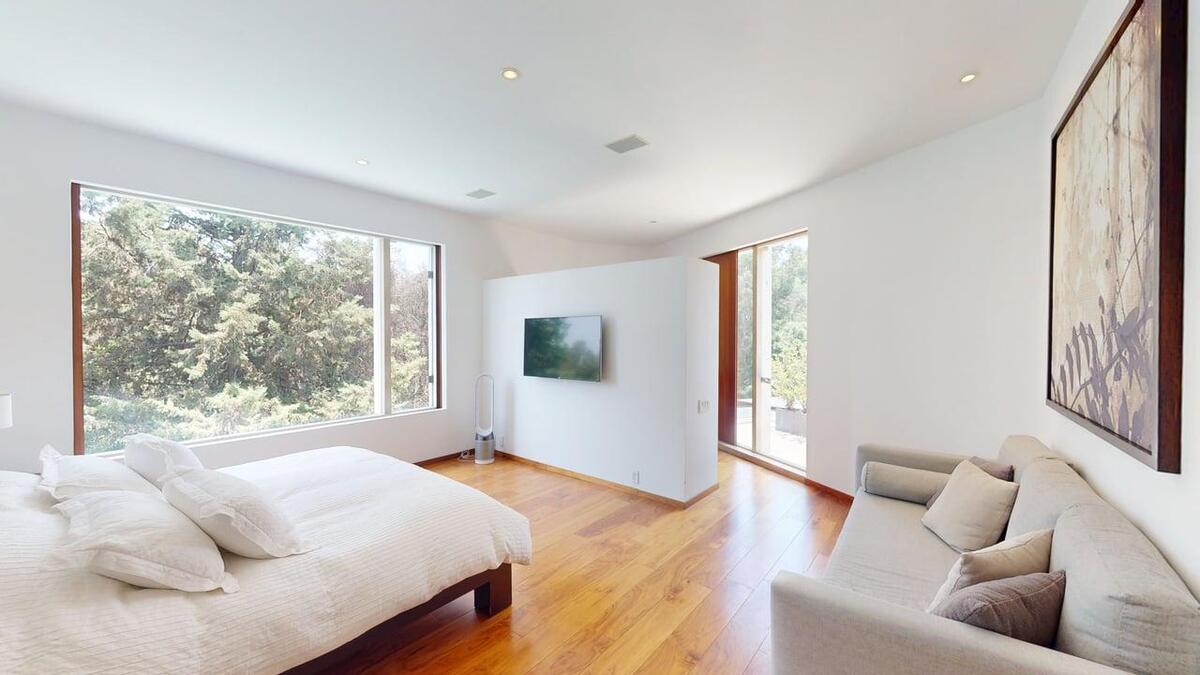 Master suite con área para sala y estudio, vista panorámica al bosque, dos vestidores y un baño de lujo con iluminación natural