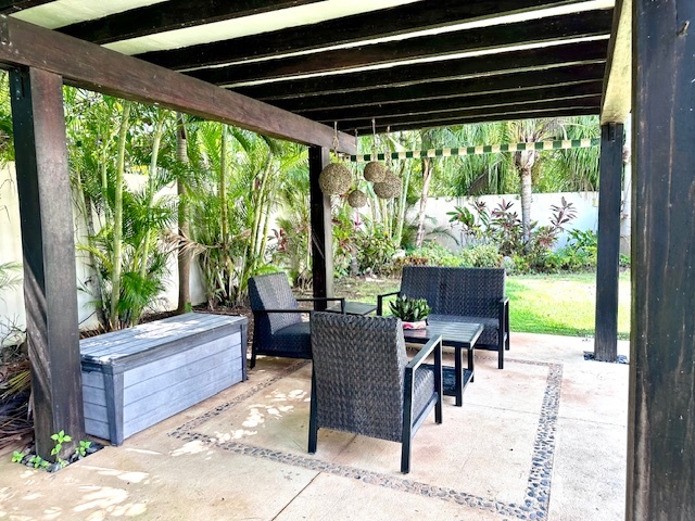 Service area with room and full bathroom, covered laundry area, and drying area.