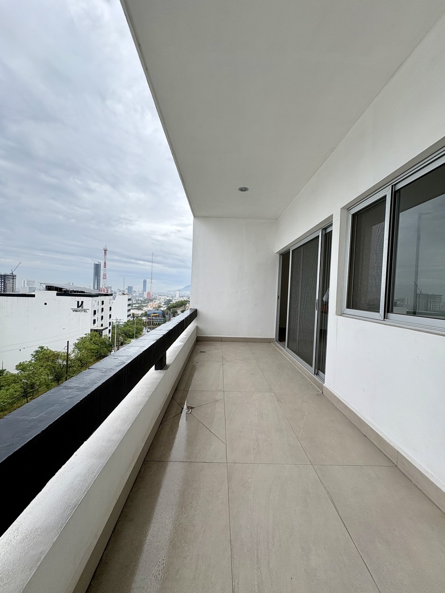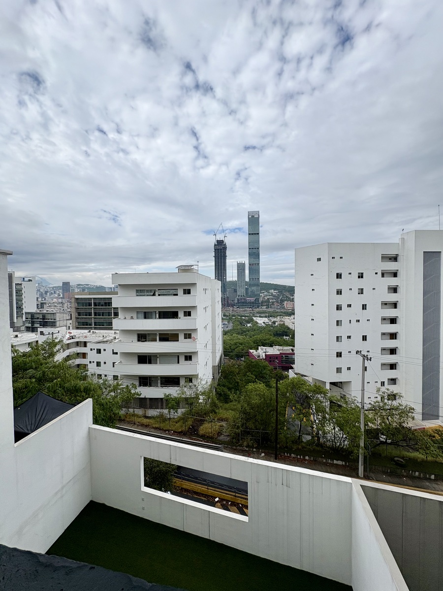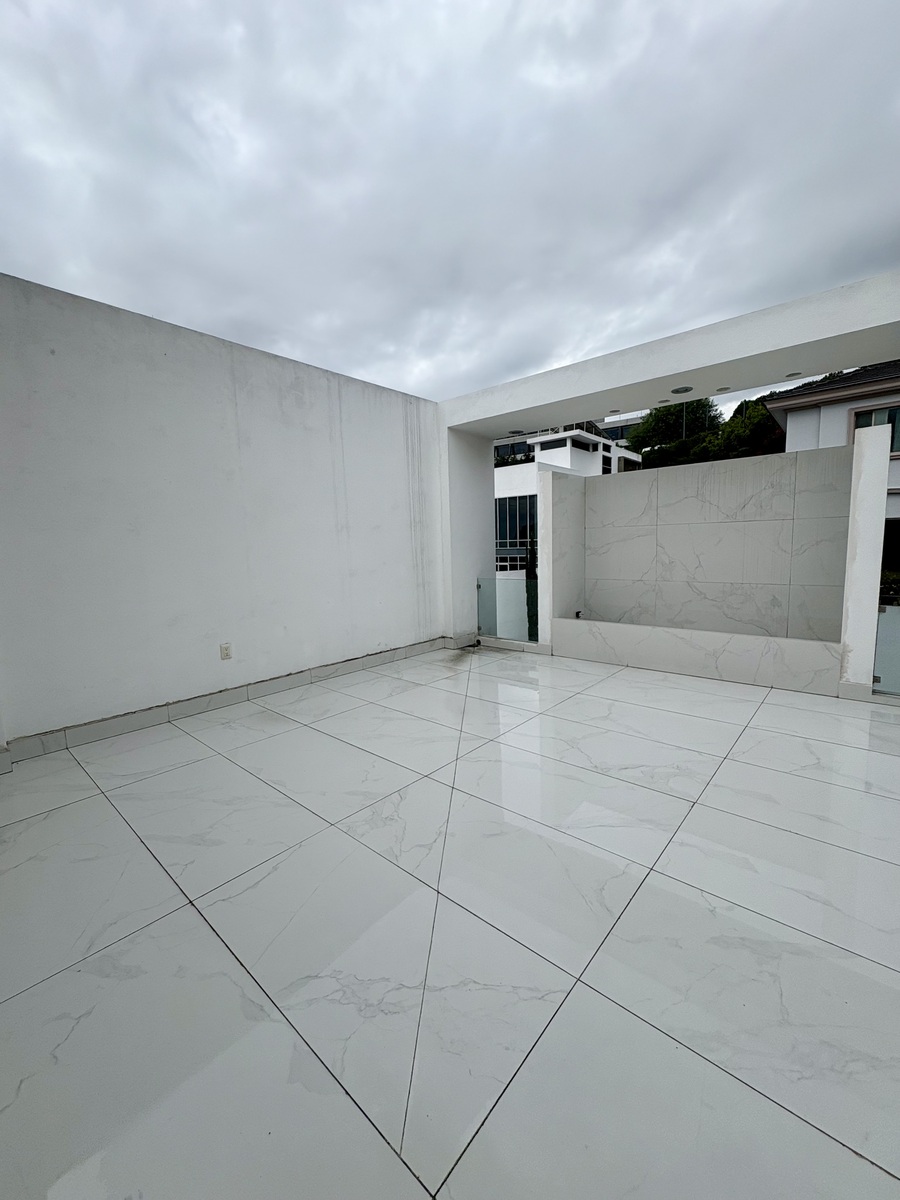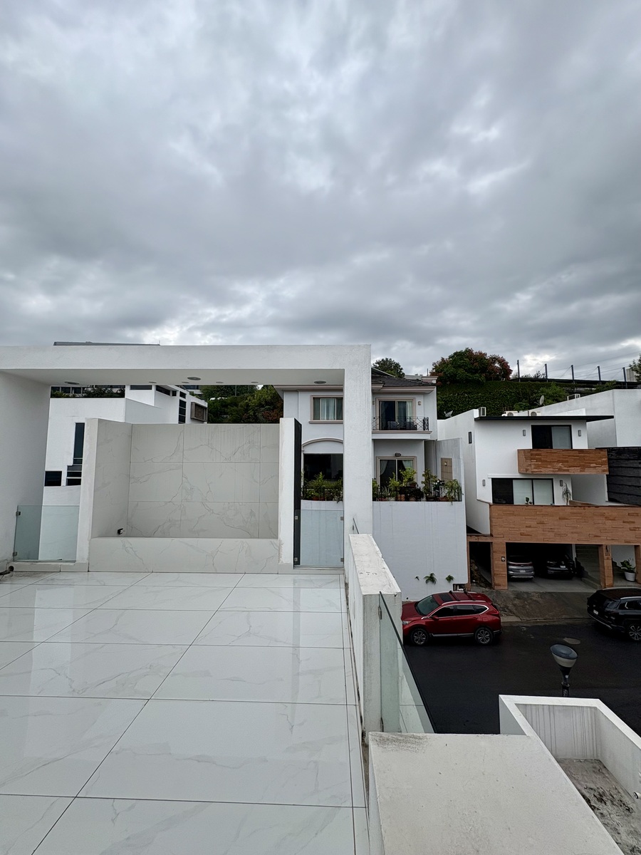 Balcón al frente con fuente tipo cascada, cada piso tiene balcón independiente y terraza panorámica en la parte de atrás.