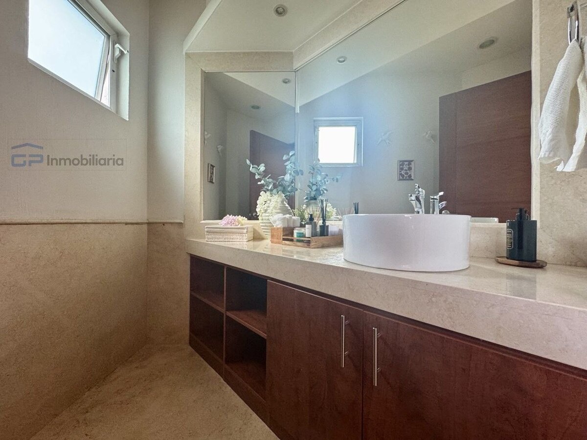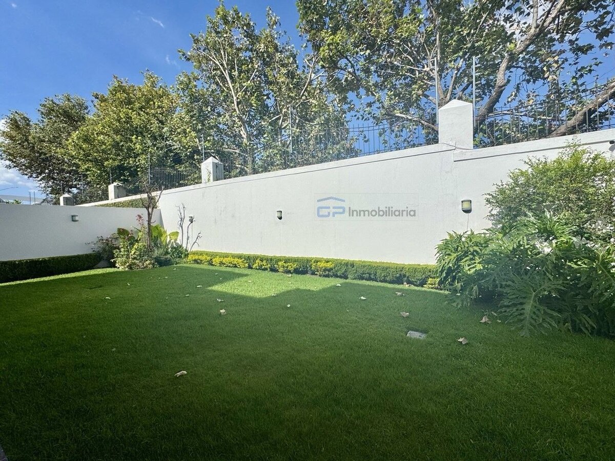 * entrance hall with double height, half bathroom, living-dining room with a view of the garden, covered terrace with a fountain in the garden, has a lateral area, open integral kitchen with granite bar, bedroom with dressing room, bathroom with tub, laundry area, service room with full bathroom. Garage for 4 cars, 2 covered and 2 semi-covered.