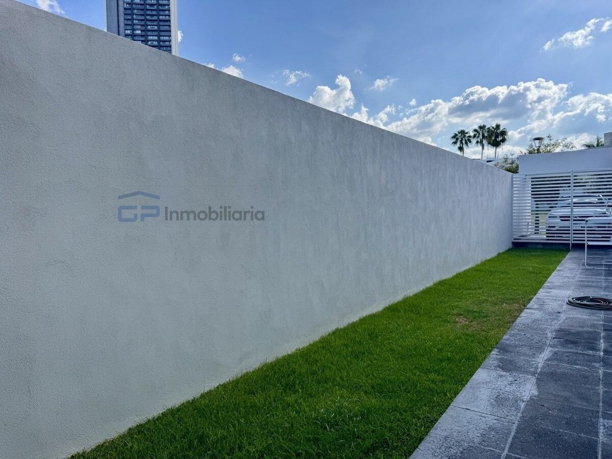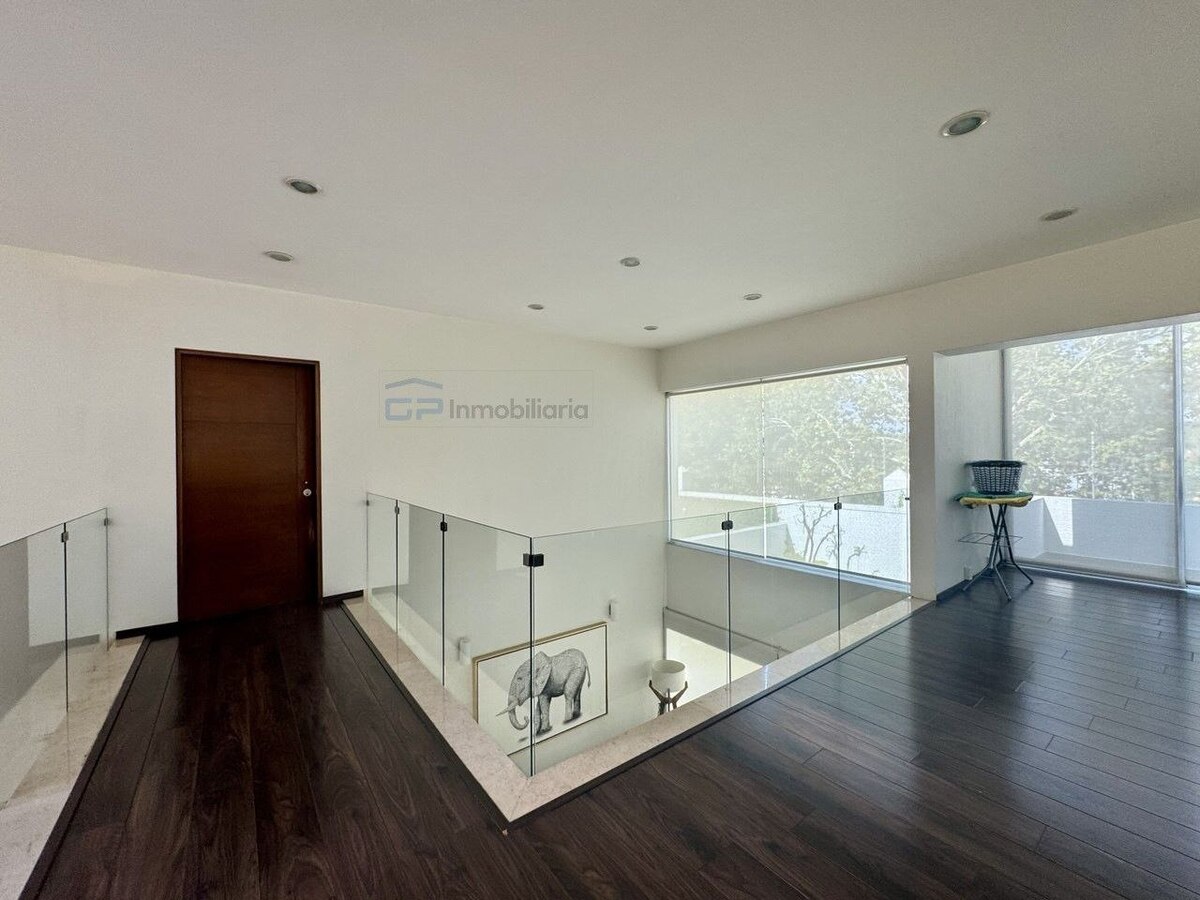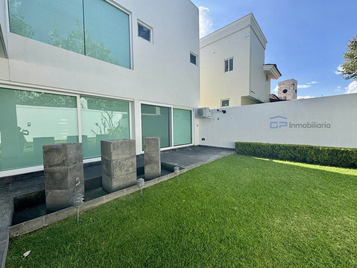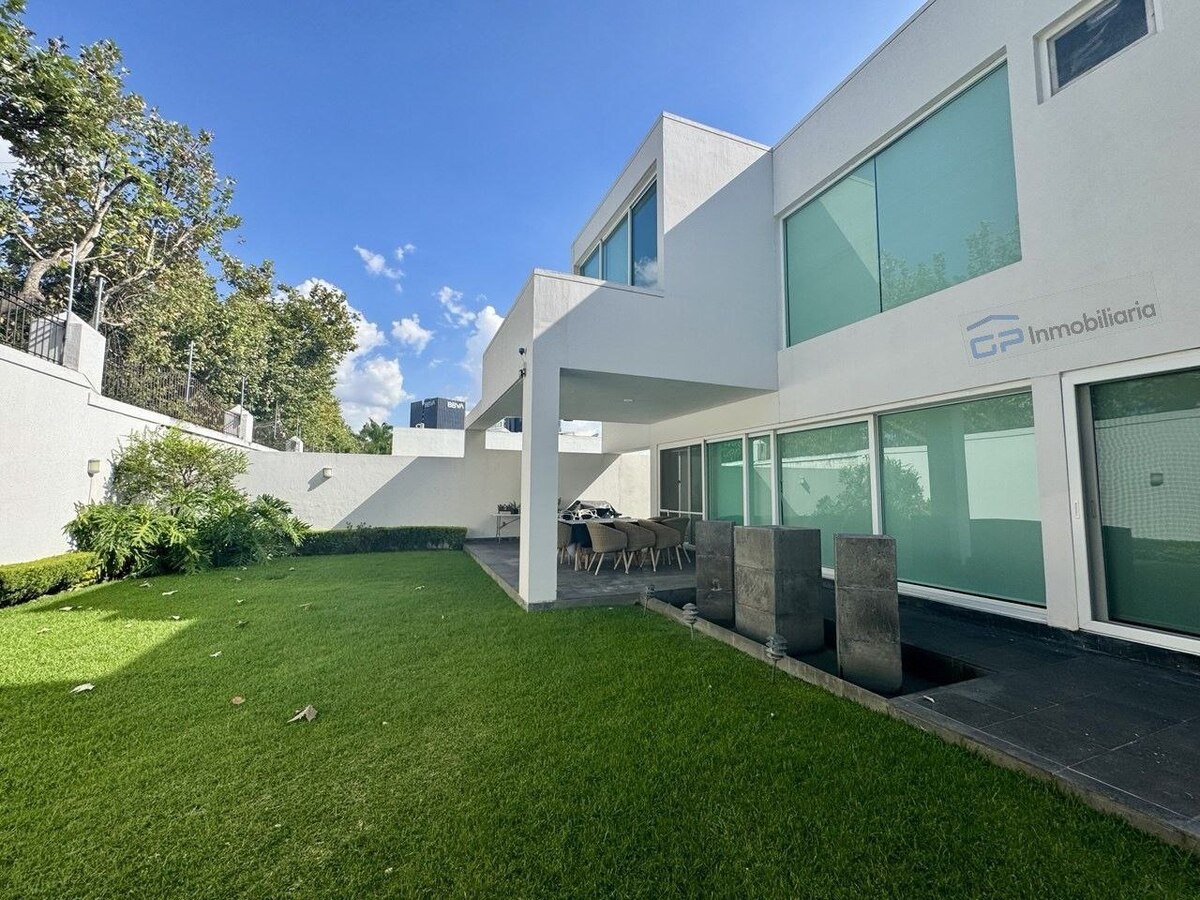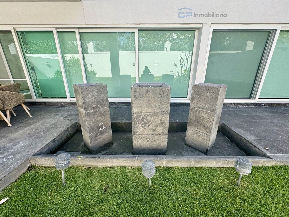 * recibidor con doble altura, medio baño, sala - comedor con vista al jardin , terraza techada con fuente en el jardín, cuenta con área lateral, cocina integral abierta con barra de granito, recámara con vestidor, baño con tina, área de lavado , cuarto de servicio con baño completo. Cochera para 4 automóviles, 2 techados y 2 semi techados.