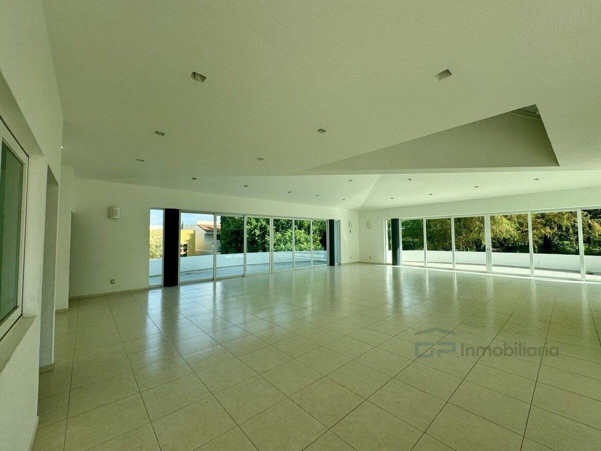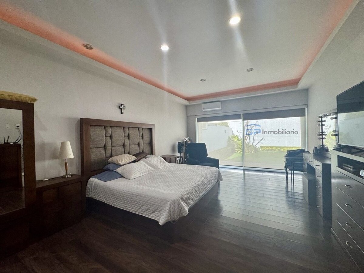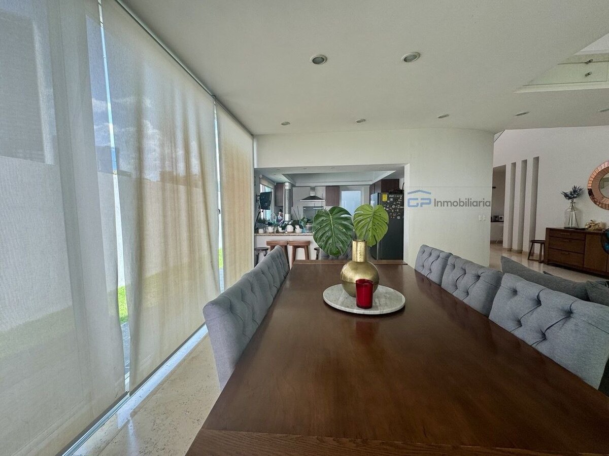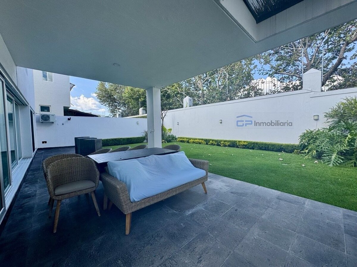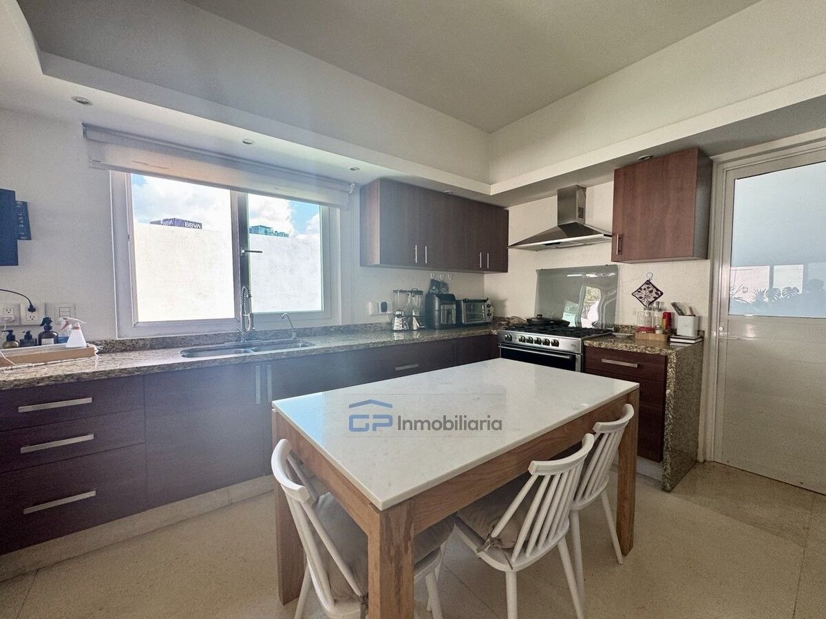 * recibidor con doble altura, medio baño, sala - comedor con vista al jardin , terraza techada con fuente en el jardín, cuenta con área lateral, cocina integral abierta con barra de granito, recámara con vestidor, baño con tina, área de lavado , cuarto de servicio con baño completo. Cochera para 4 automóviles, 2 techados y 2 semi techados.