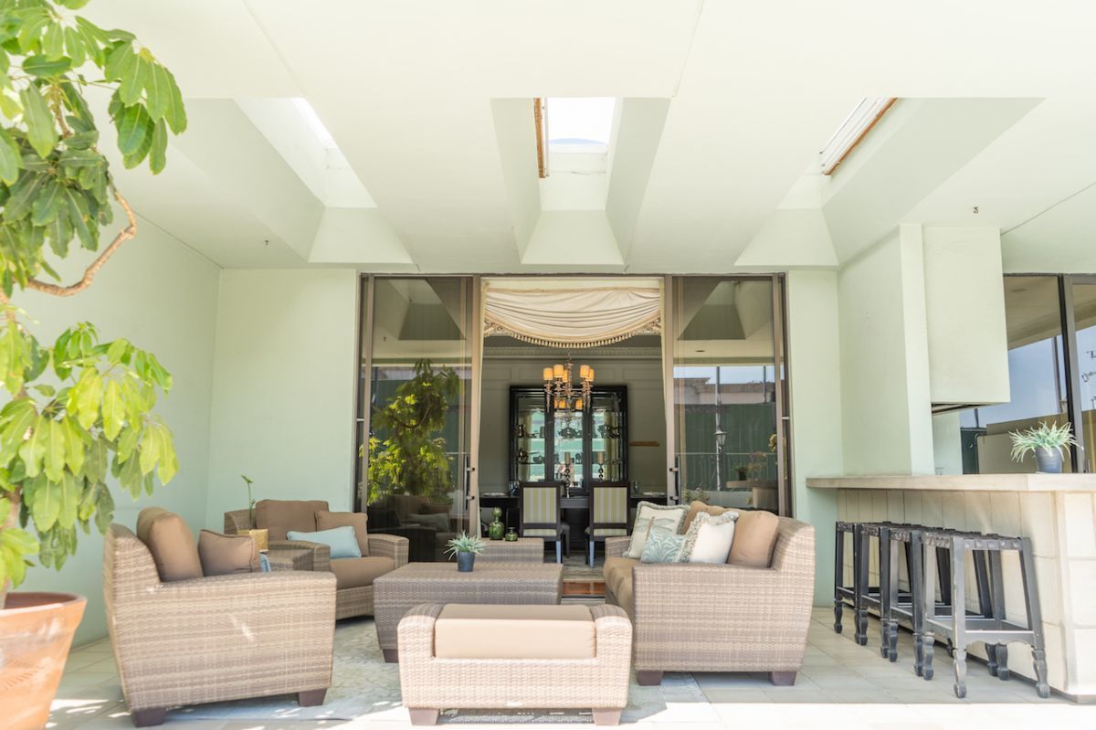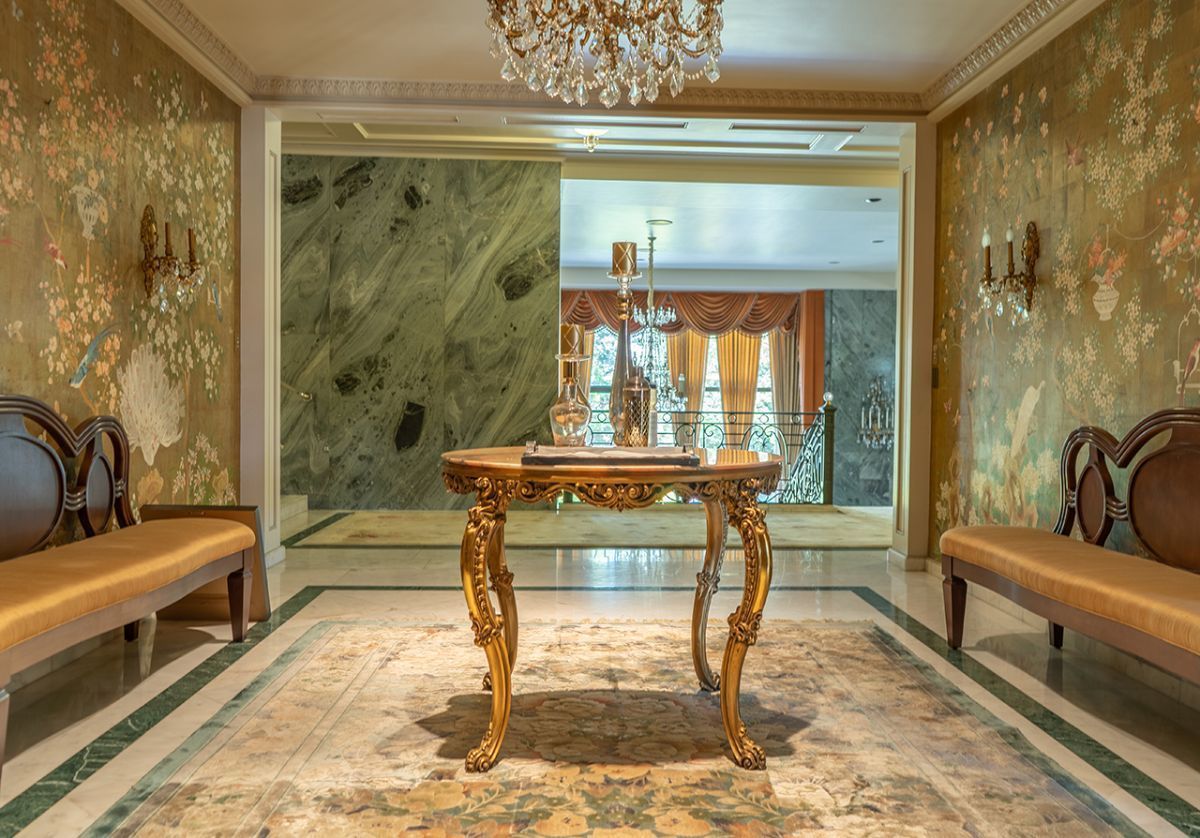La entrada principal con una hermosa puerta de madera grabada que te da la bienvenida a un recibidor con un candelabro espectacular, y vista a la sala principal, con ventanales a través de los cuales puedes apreciar sus enormes jardines; la sala cuenta con un candelabro de finos cristales en el centro de esta, y una chimenea seguida de un comedor para 20 personas que de igual manera puedes apreciar la vista al jardín.