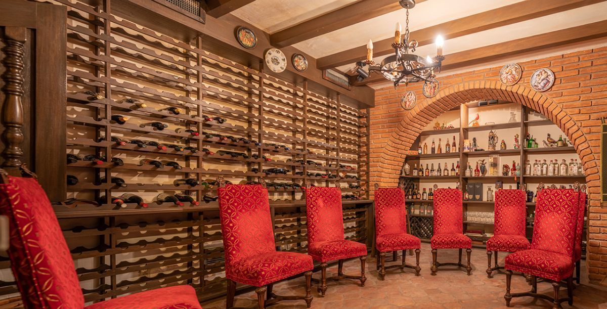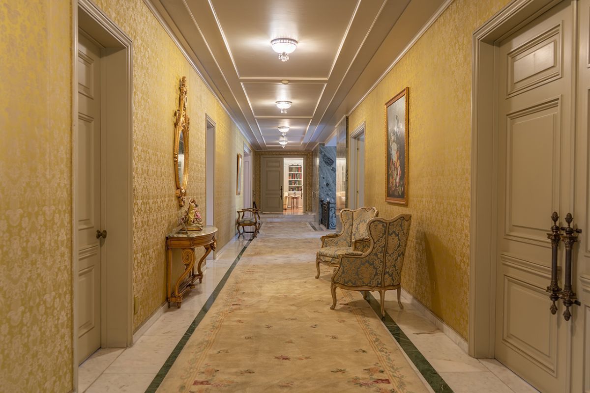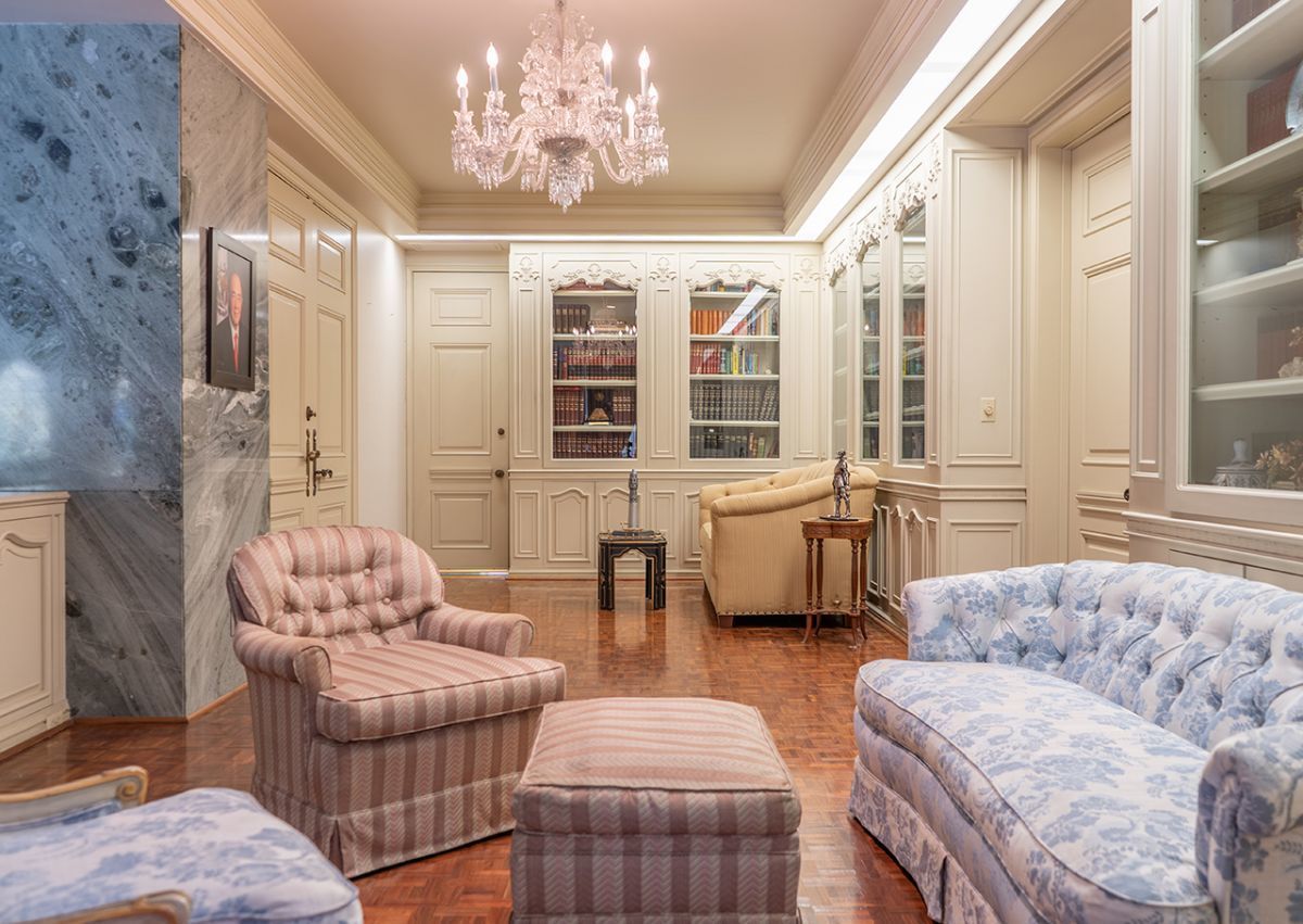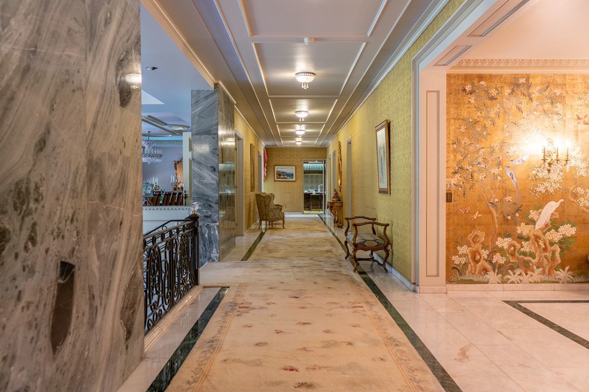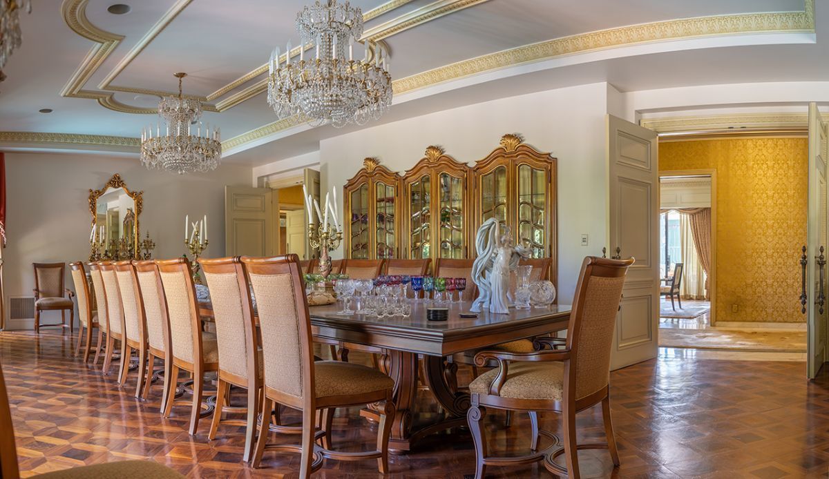 The main entrance with a beautiful engraved wooden door that welcomes you to a hall with a spectacular chandelier, and a view of the main room, with windows through which you can see its enormous gardens; the room has a chandelier of fine glass in the center of it, and a fireplace followed by a dining room for 20 people who can also appreciate the view of the garden.