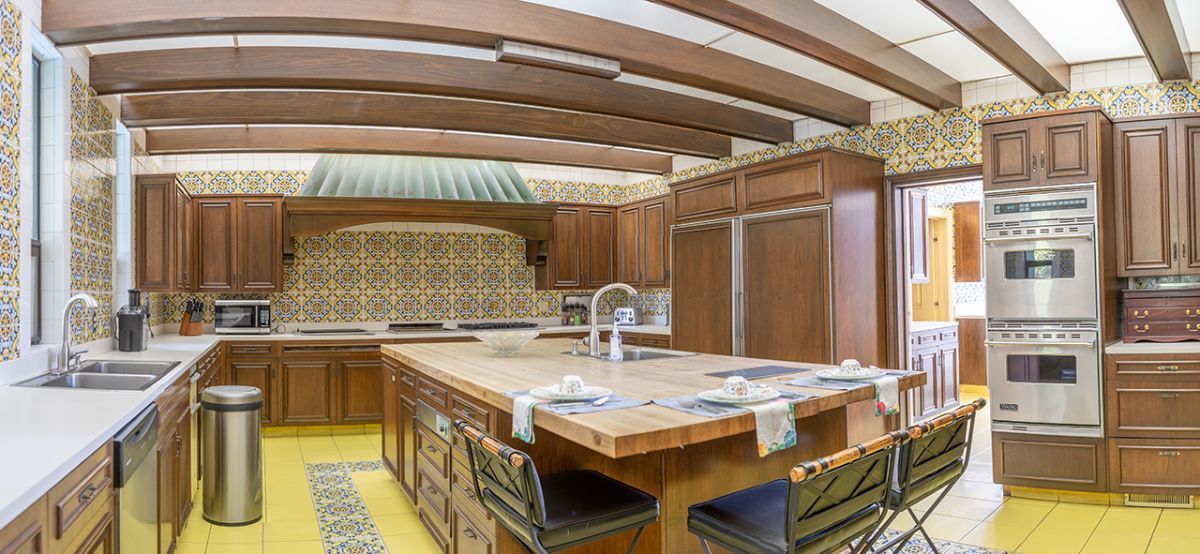 Cocina amplia con muebles de fina madera color café, con electrodomésticos, como refrigerador estufa, plancha parrilla, hornos, lavadora de trastes, alacena, y al centro una barra muy grande para comida informal con 3 sillas y cuarto de servicios con área de alacenas.