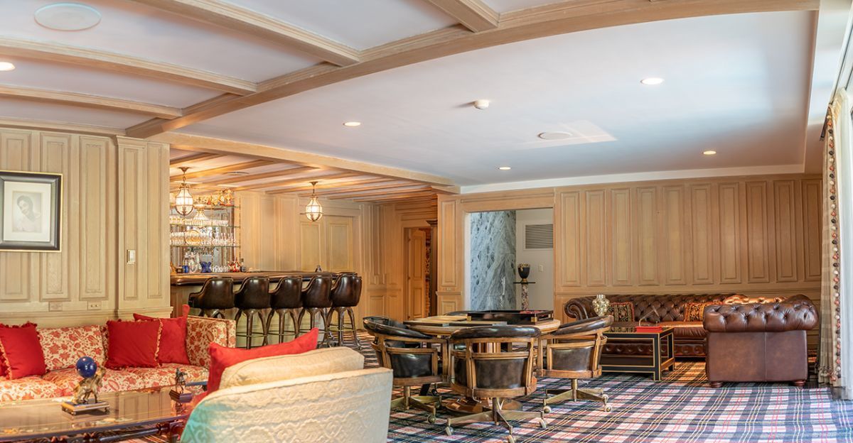 Bar y sala de juegos con chimenea, mesas para juegos, salida a la alberca y jardines; con fuente