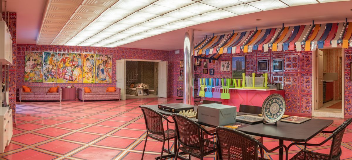 Bar and games room with fireplace, tables for games, access to the pool and gardens; with fountain