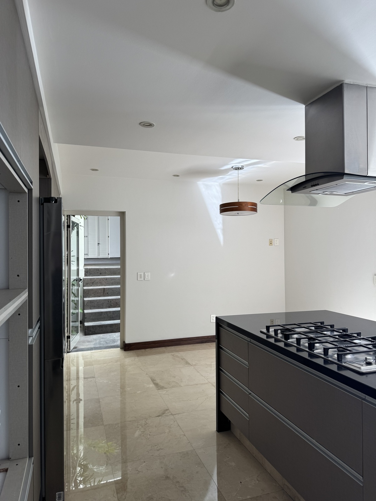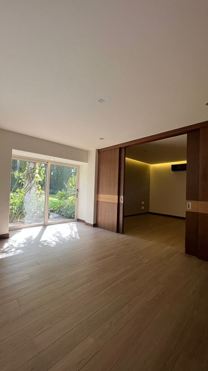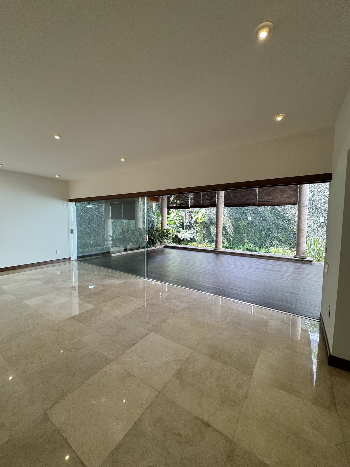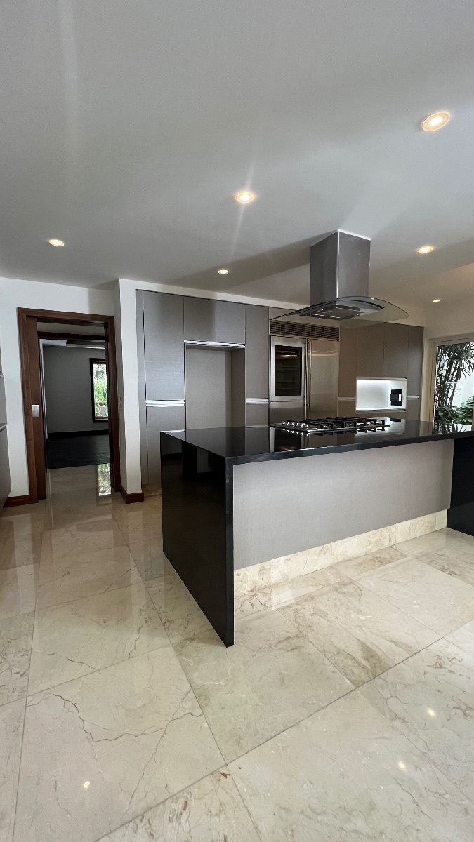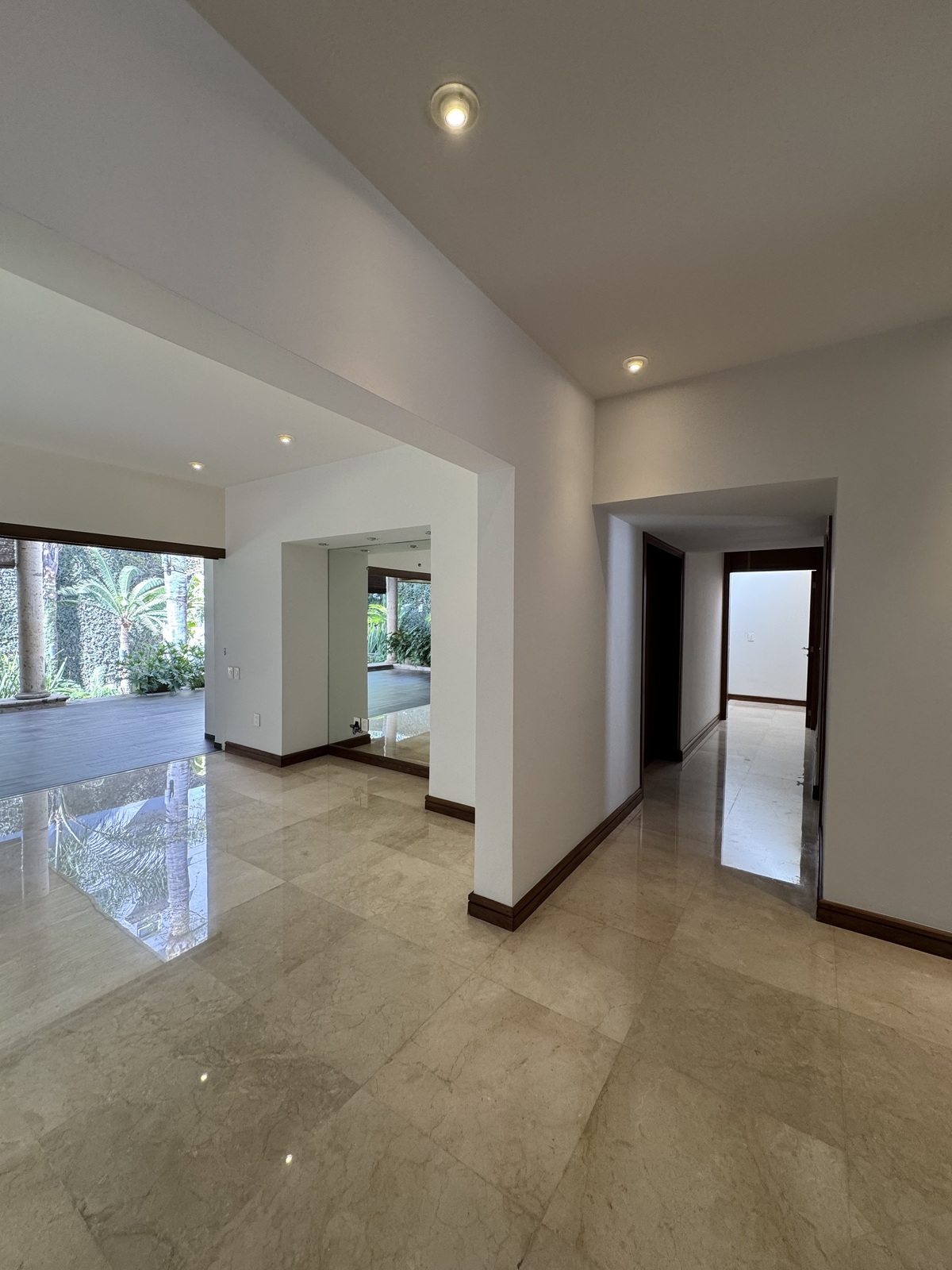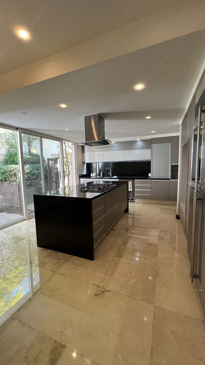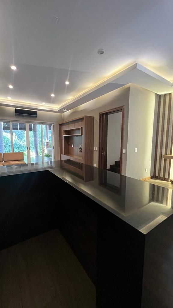 Upon entering, you are greeted by a spacious foyer that leads to the main social areas of the house. The living room, with high ceilings and large windows that allow natural light to enter, is designed to be the heart of the home, offering a perfect space for relaxation and socializing. Next to it, the private bar, with fine wood finishes and a marble counter, invites you to enjoy moments of relaxation or social gatherings in a sophisticated atmosphere.