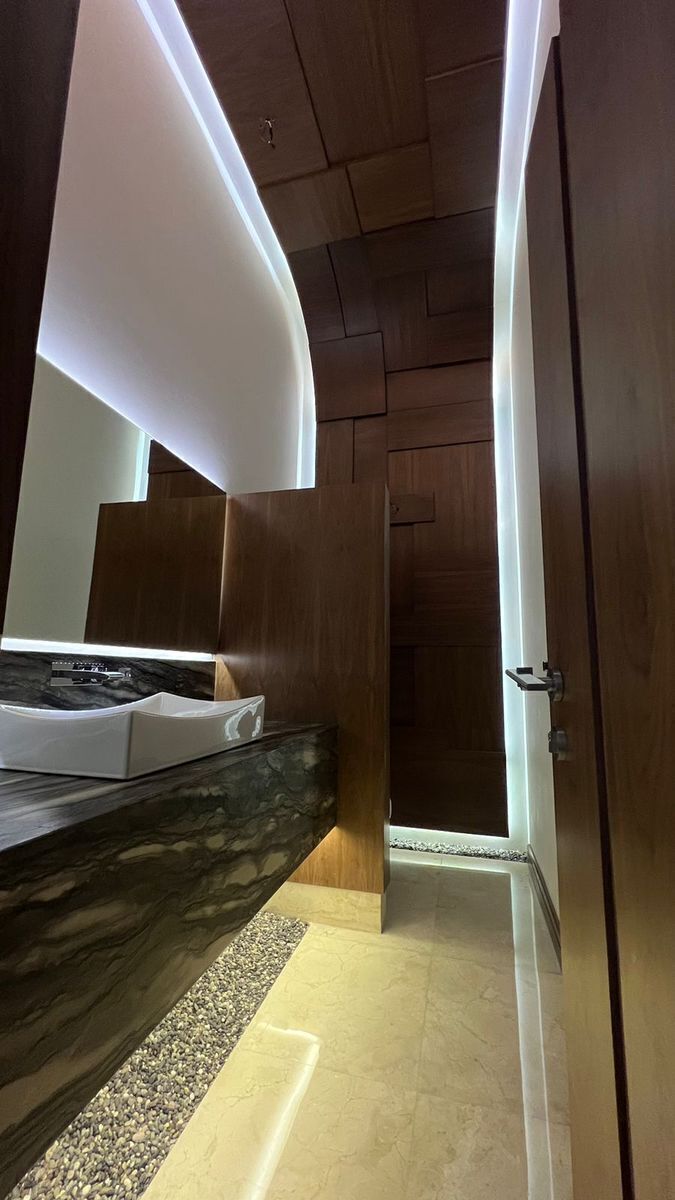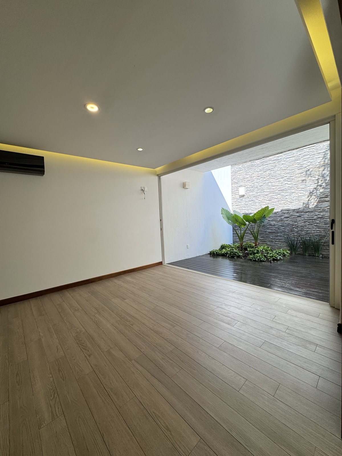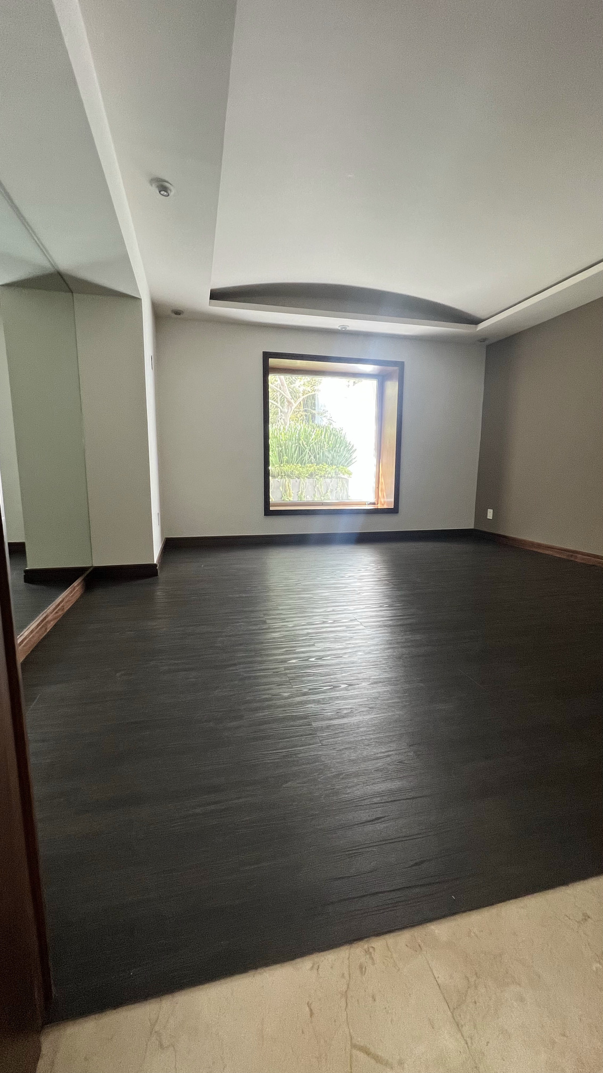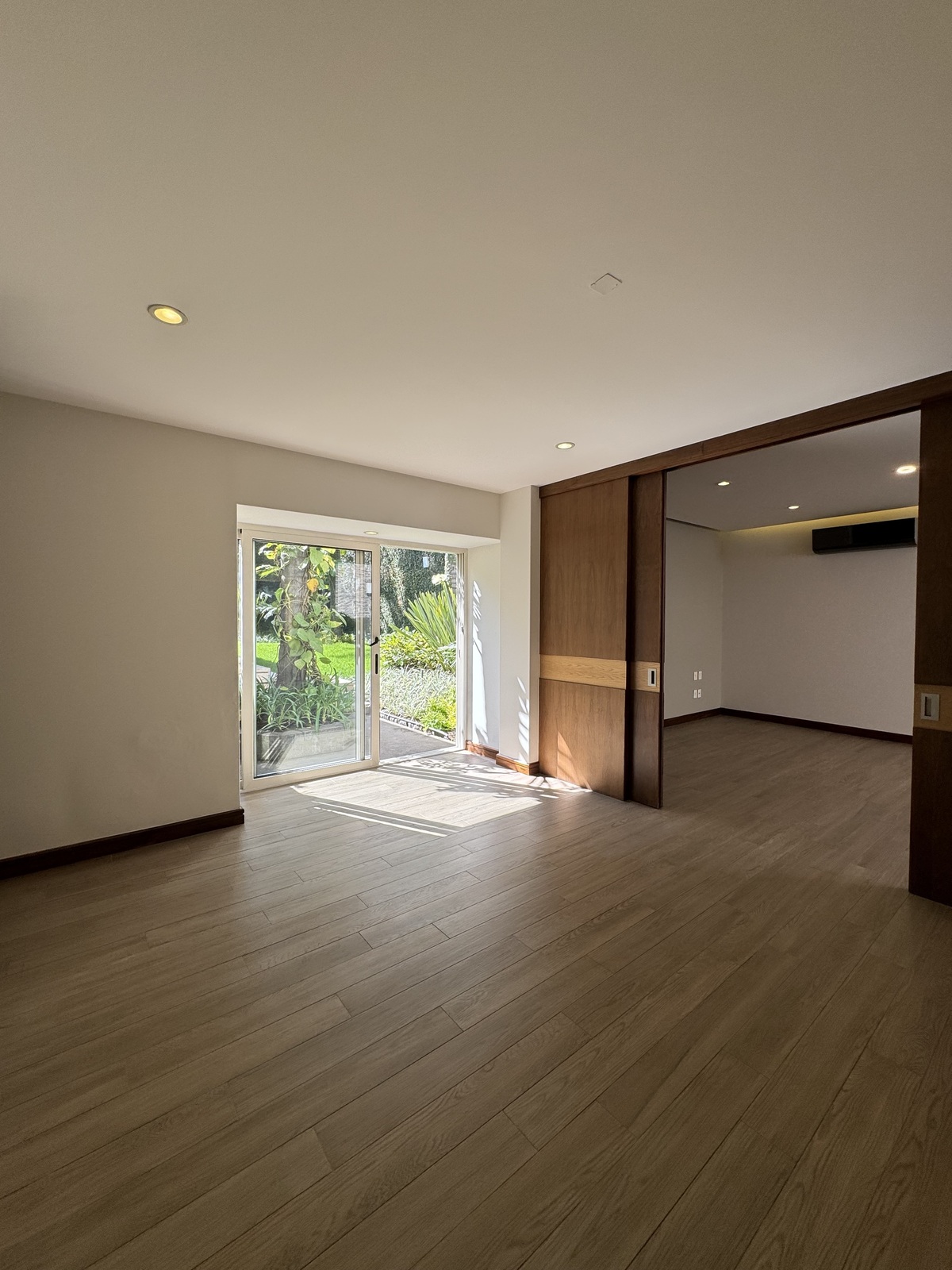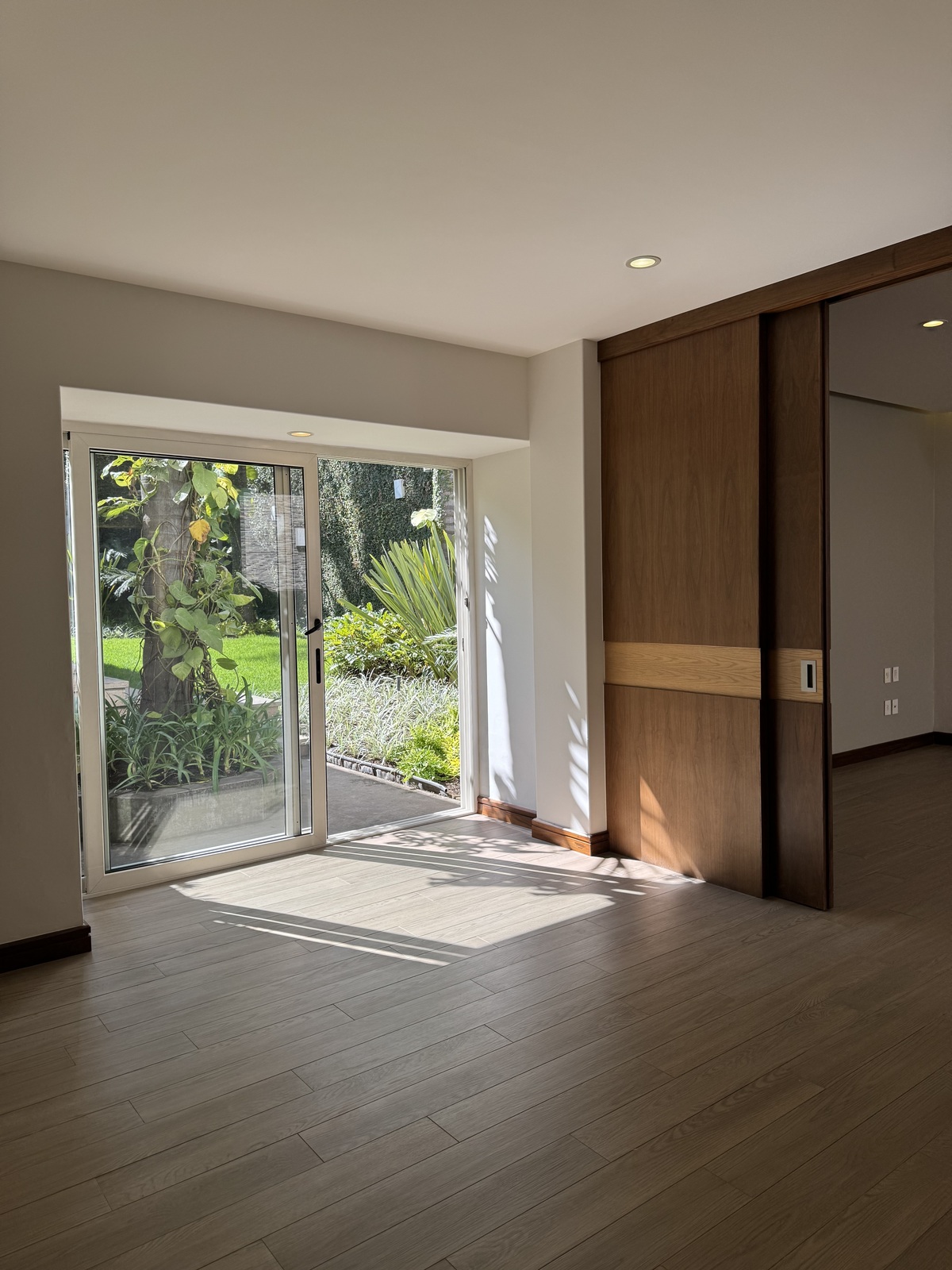 Upon entering, you are greeted by a spacious foyer that leads to the main social areas of the house. The living room, with high ceilings and large windows that allow natural light to enter, is designed to be the heart of the home, offering a perfect space for relaxation and socializing. Next to it, the private bar, with fine wood finishes and a marble counter, invites you to enjoy moments of relaxation or social gatherings in a sophisticated atmosphere.