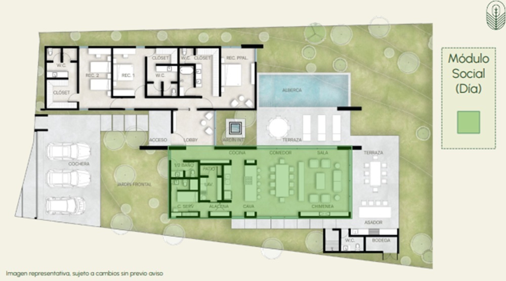 Módulo Social (Día): Cocina, sala y comedor, así como cuarto de servicio y lavandería.