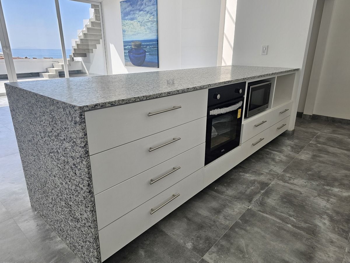 Cocina integral con barra y cubierta de granito, equipada con estufa, horno, campana y monomando.