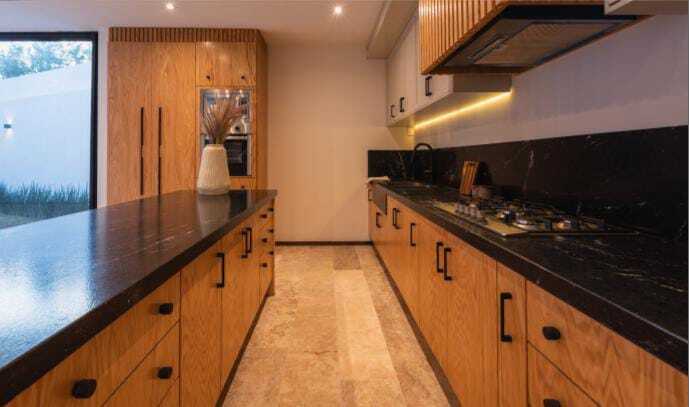cocina abierta con barra de granito y muebles de madera, con equipamiento como horno y horno de microondas, parrilla y campana.