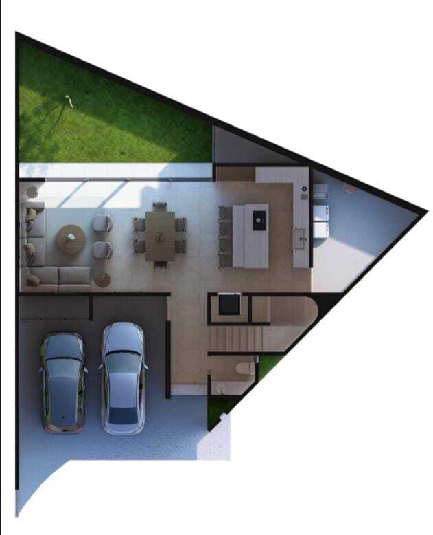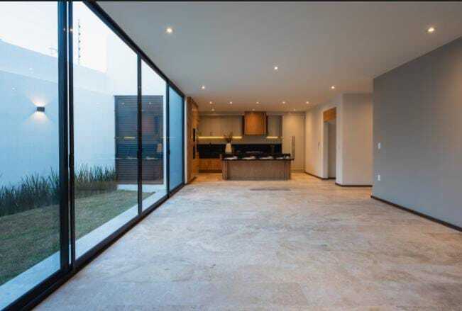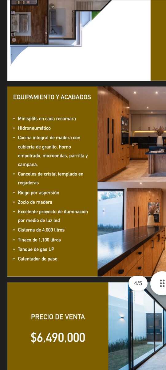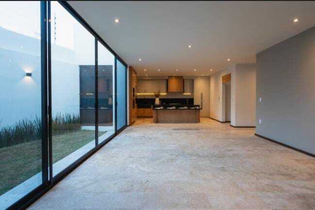 Cocina, canceles de cristal templado, lavanetas y espejos en los baños equipamiento electrónico plus con luz Led en toda la casa, con pasto en área de jardín y plantas decorativas al frente.