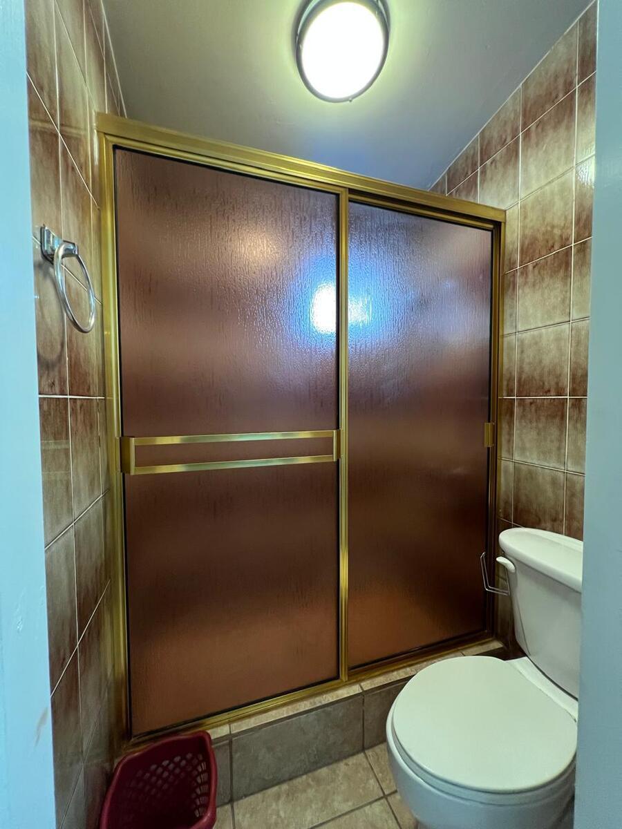 Two full bathrooms, featuring glass block showers, decorative tile accents, and artistic touches