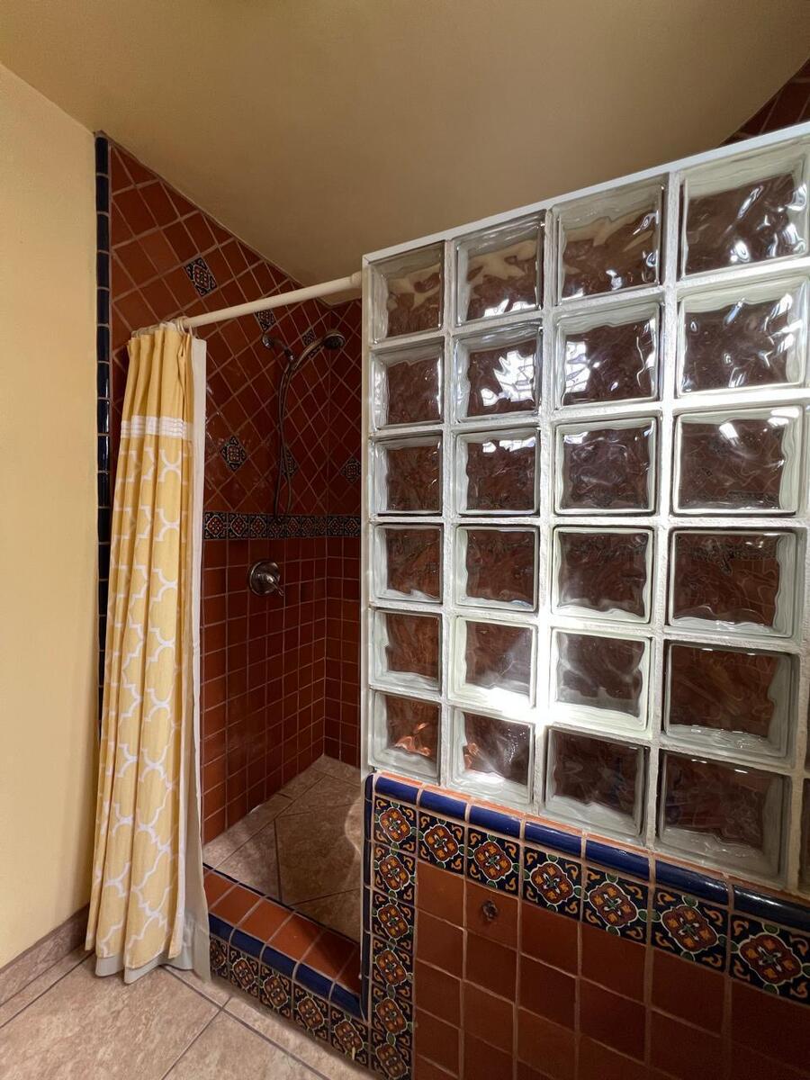 Two full bathrooms, with glass-block showers, decorative tile accents, and artistic touches