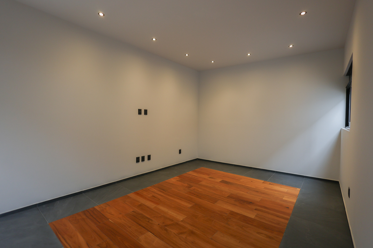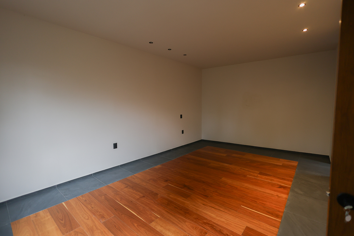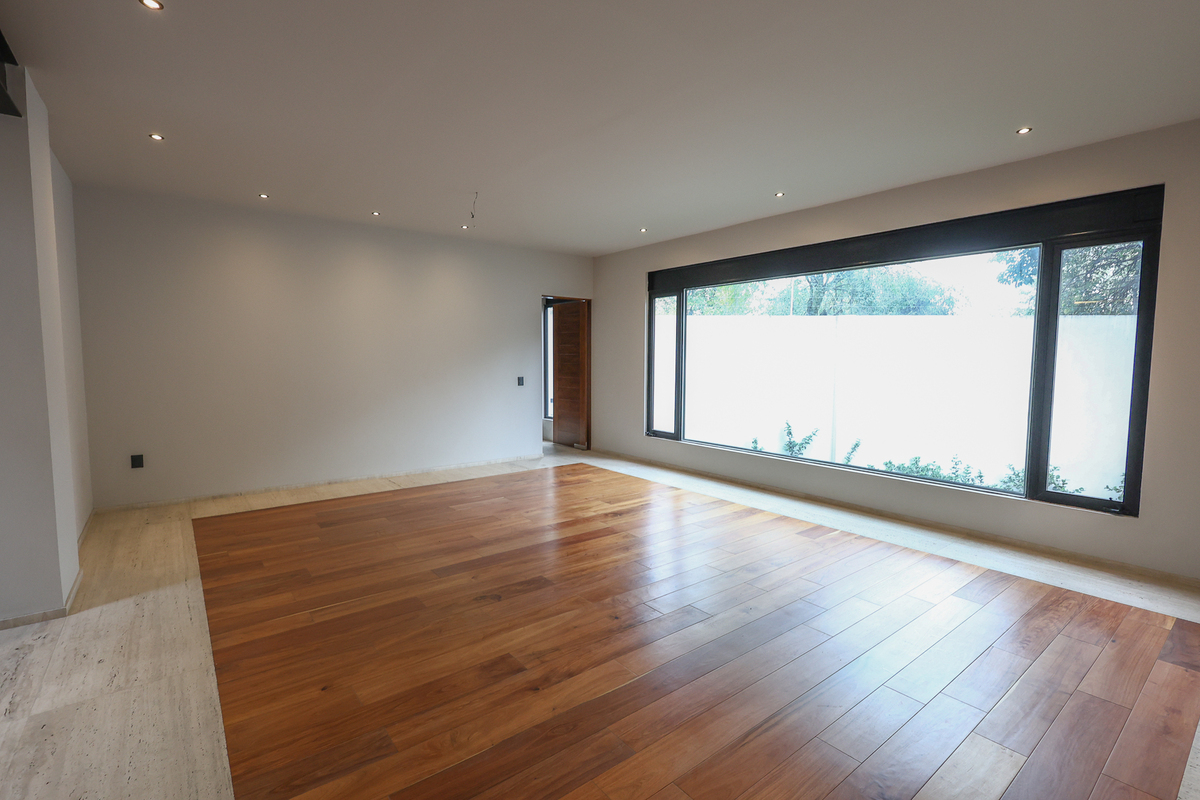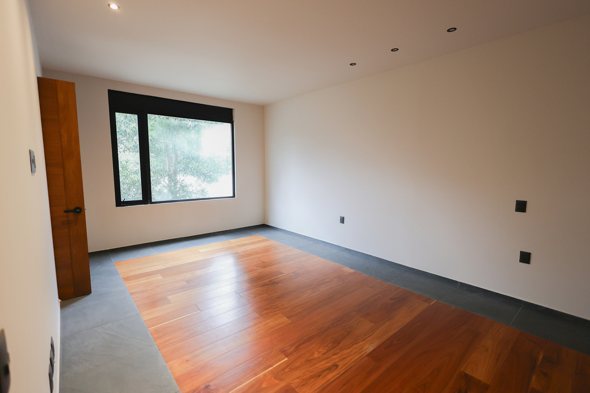 On the lower level, there is a large living room with a full bathroom and direct access to the 75 m² garden, perfect for gatherings or family events. This level also includes a spacious cellar, independent service area, and a room with a bathroom for the driver. On the upper floor, a central skylight and a balcony frame the entrance to three bedrooms, all with walk-in closets, private bathrooms, and green views, as well as a comfortable family room and linen closet. This newly completed residence combines luxury, functionality, and an excellent location. Come and see it.Descubre esta espectacular residencia de estilo moderno ubicada en una de las zonas más codiciadas de San Jerónimo. Su diseño contemporáneo resalta desde la fachada, con grandes ventanales, vegetación ornamental y un garaje para cuatro autos. Al ingresar, te recibe una atmósfera luminosa con techos altos, acabados en mármol en la mayor parte de la casa, detalles en madera y una distribución impecable. La planta principal ofrece una amplia área social con vistas al jardín privado, una cocina integral de diseño, medio baño para visitas y un espacio cerrado ideal para oficina, estudio o gimnasio.