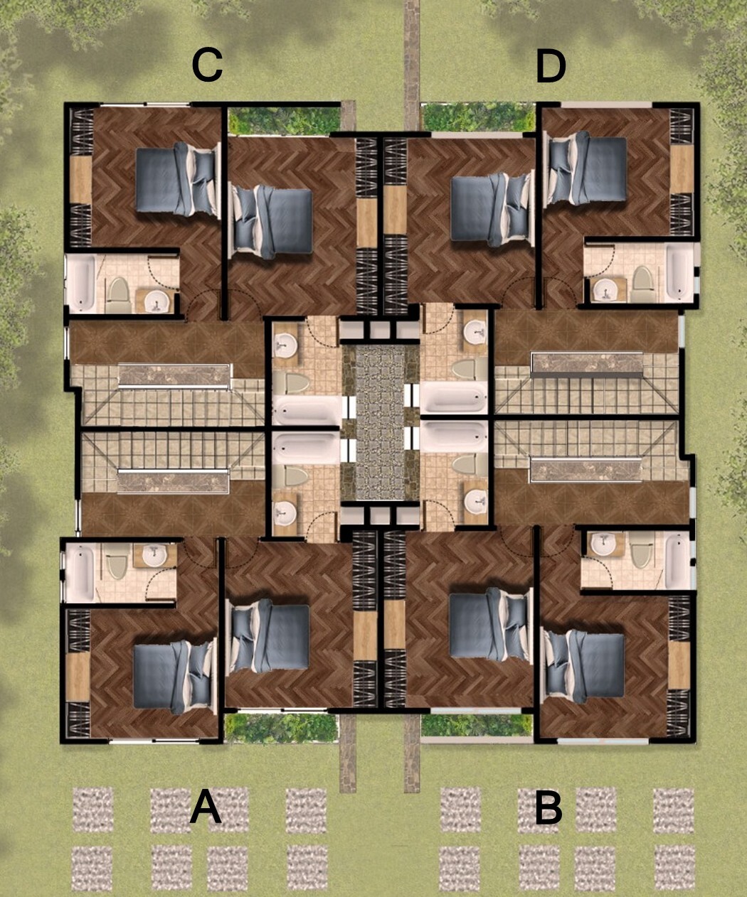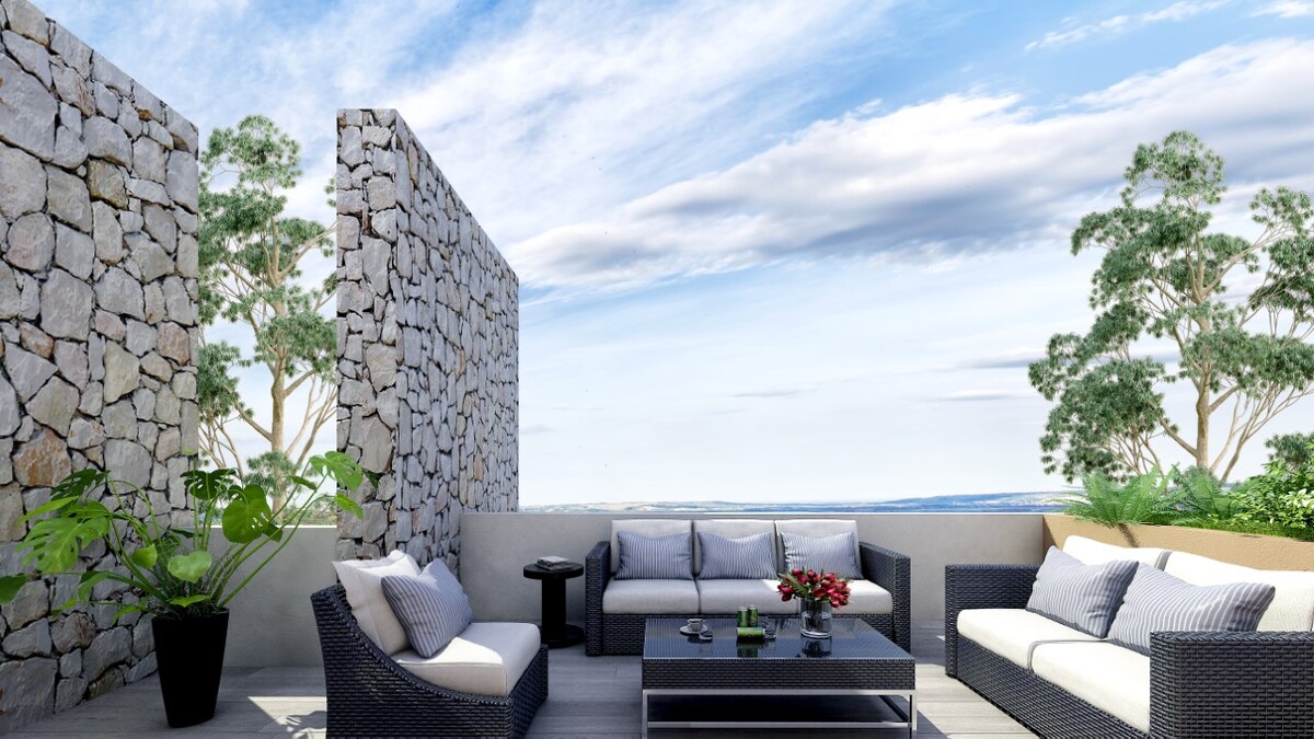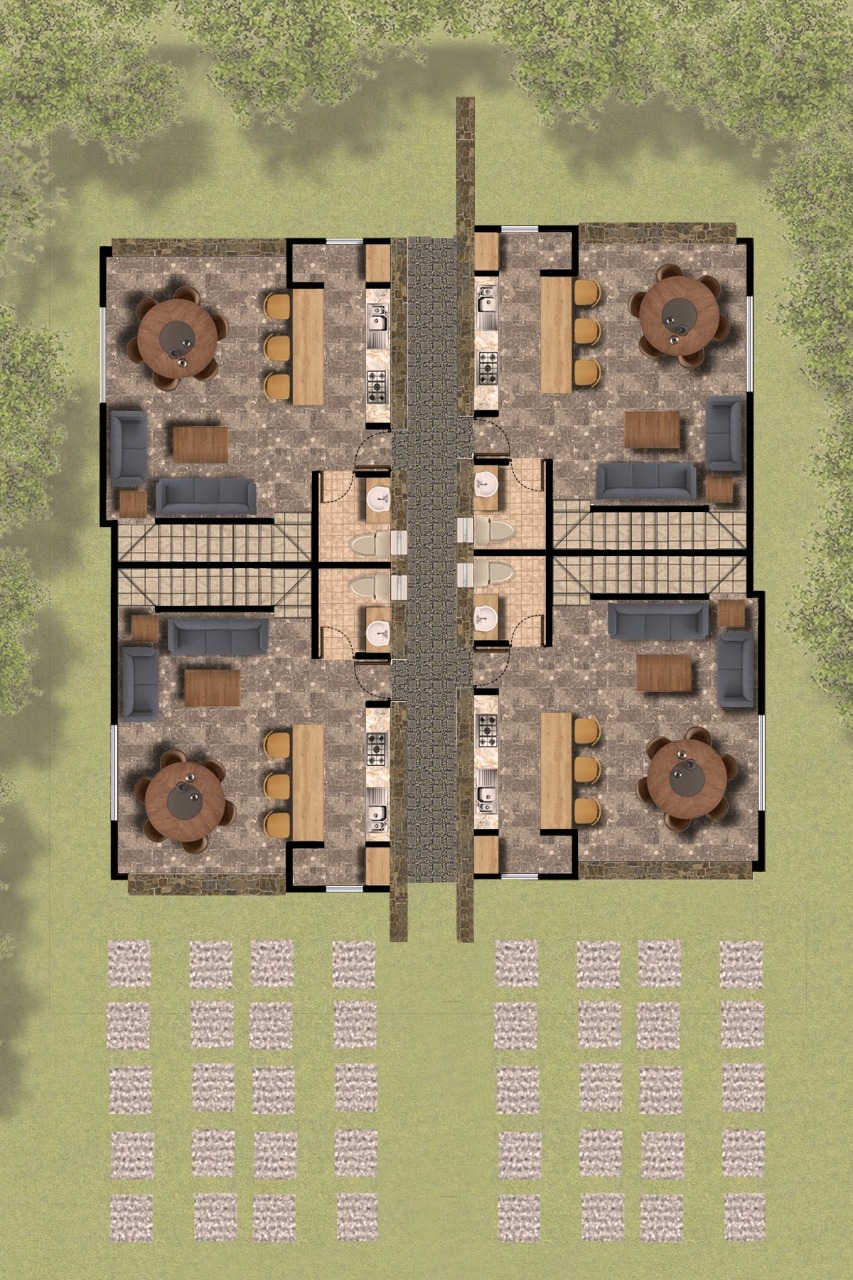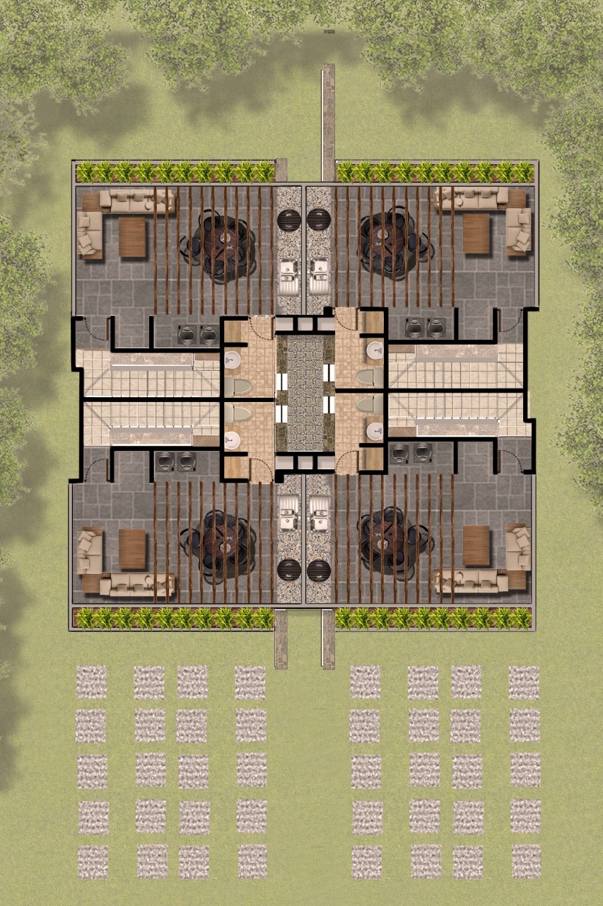 2 levels + Roof Garden. Finishes of Stone, Quarry, Wood, and other organic materials achieving a fusion between technology and nature.
