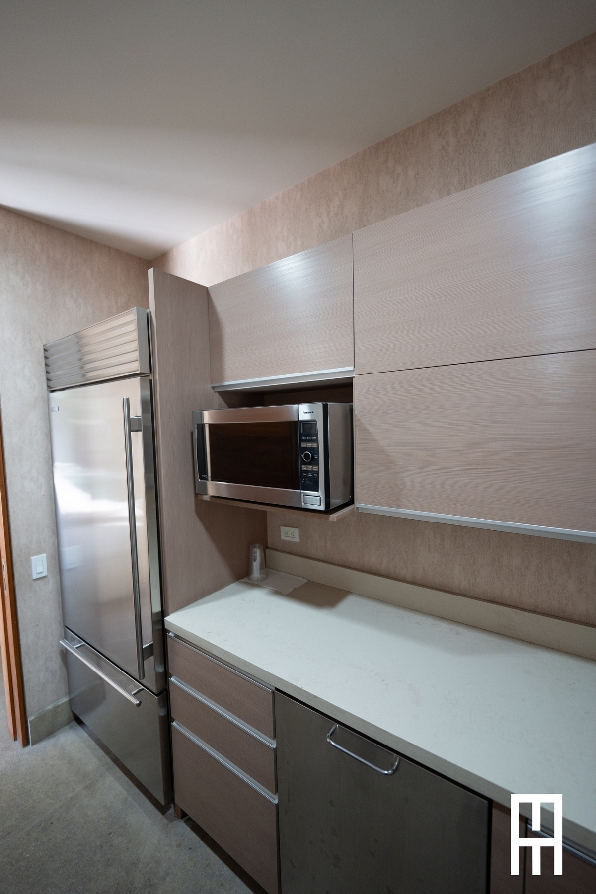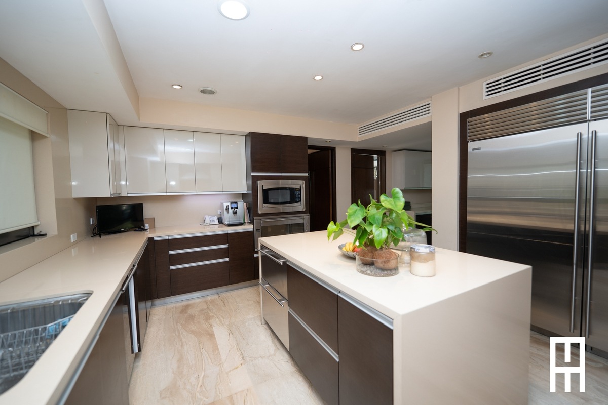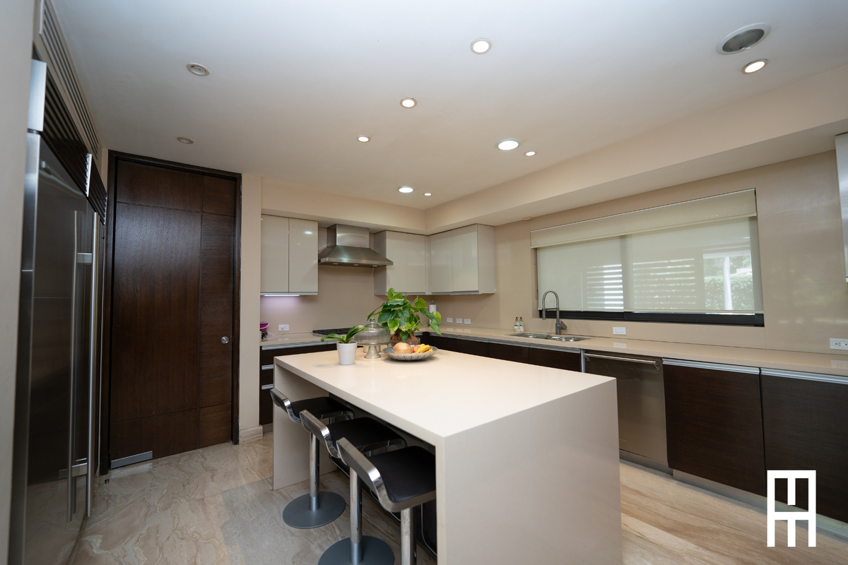 Cocina integral de alta gama con isla central, barra desayunadora y amplia alacena.