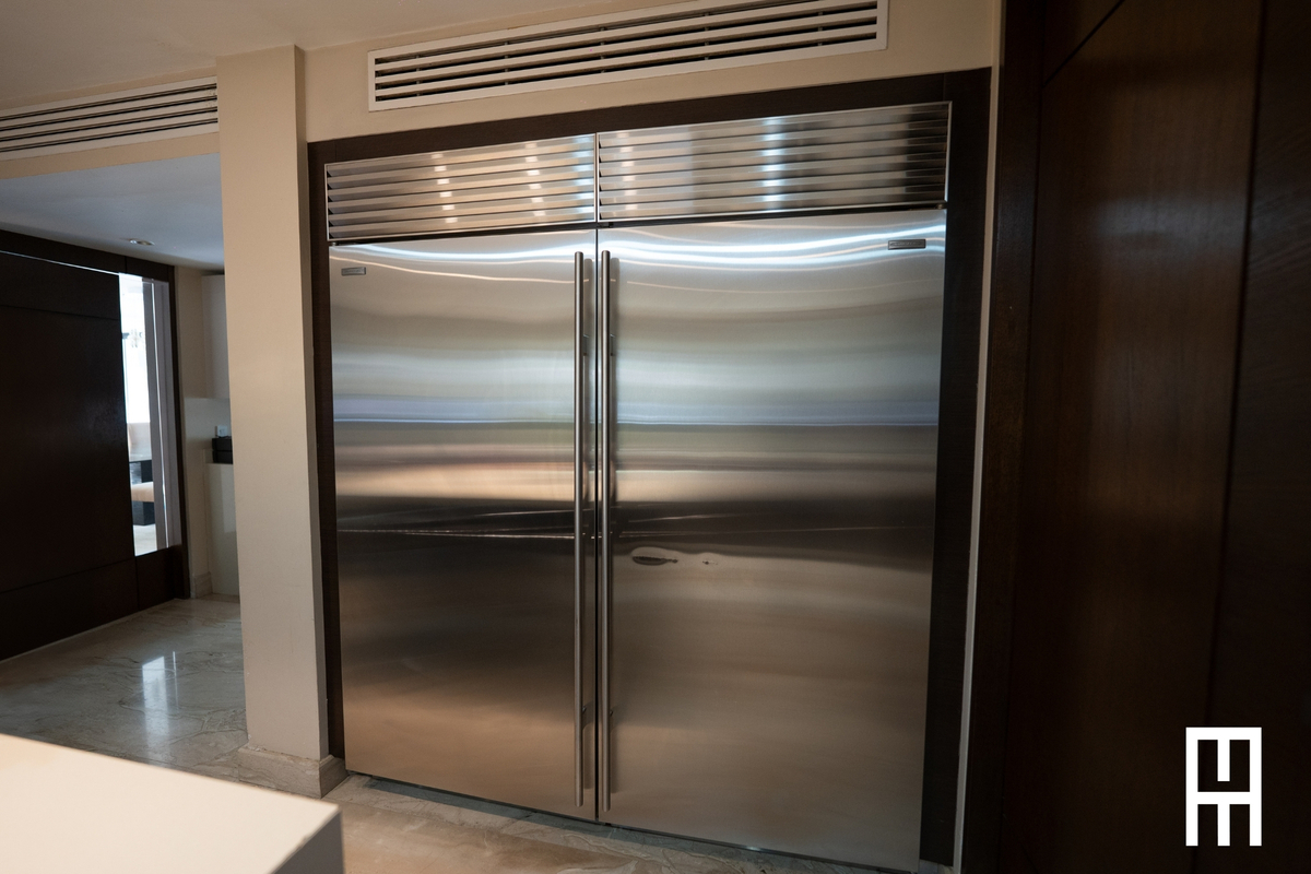 High-end integral kitchen with central island, breakfast bar, and large pantry.