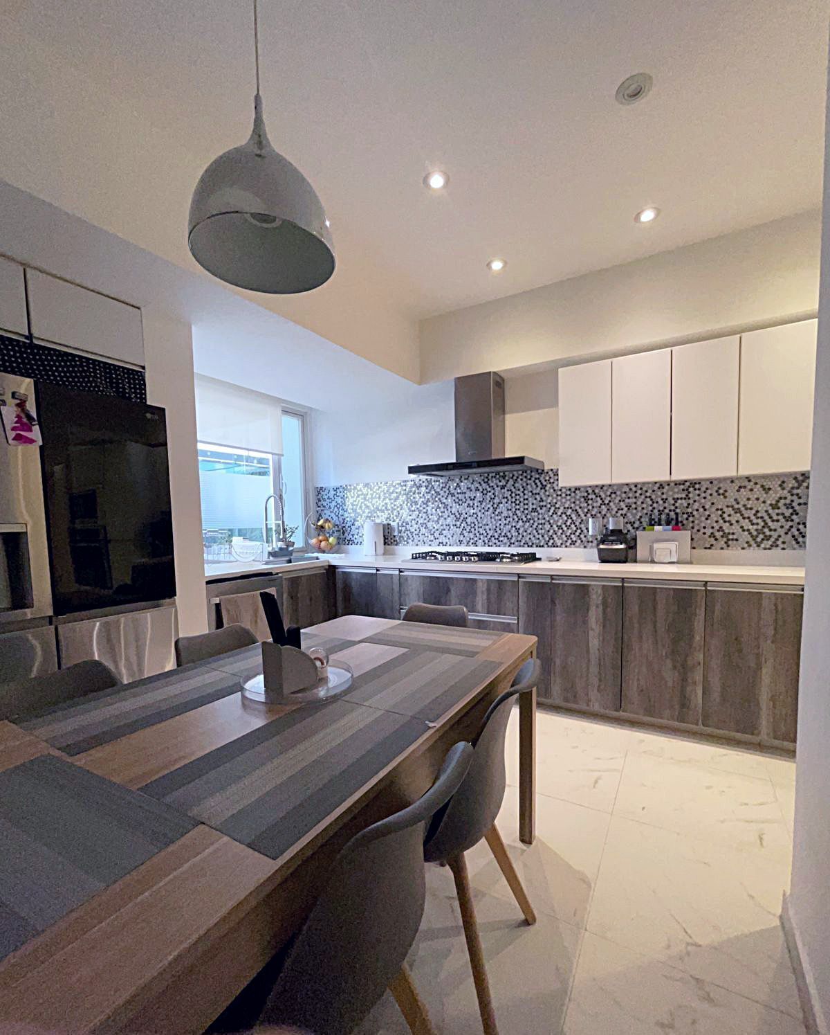 Remodeled equipped integral kitchen with white quartz and space for a breakfast area.