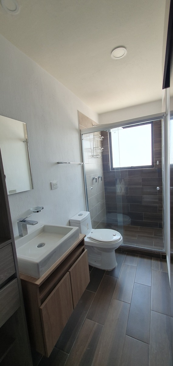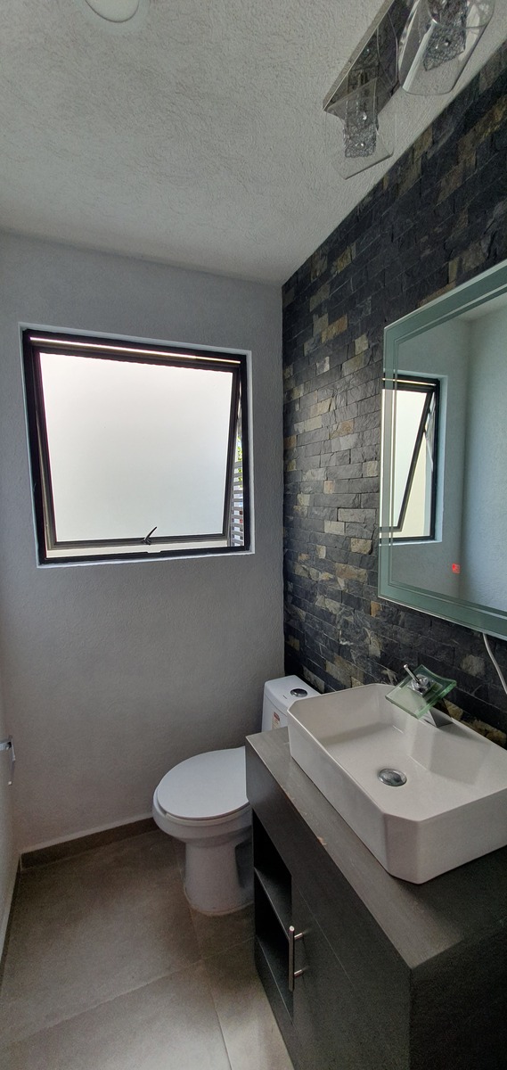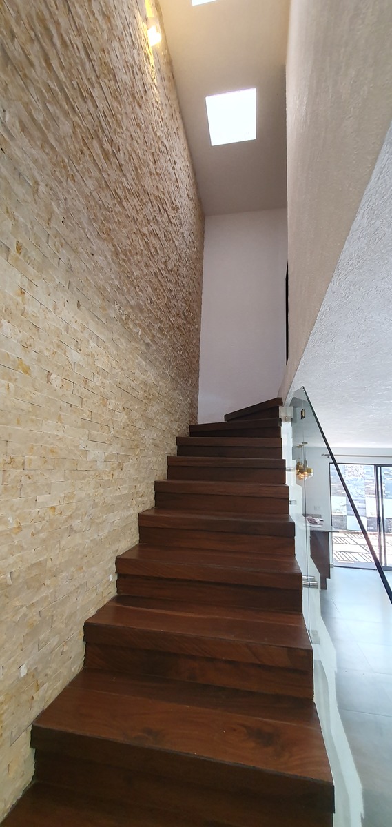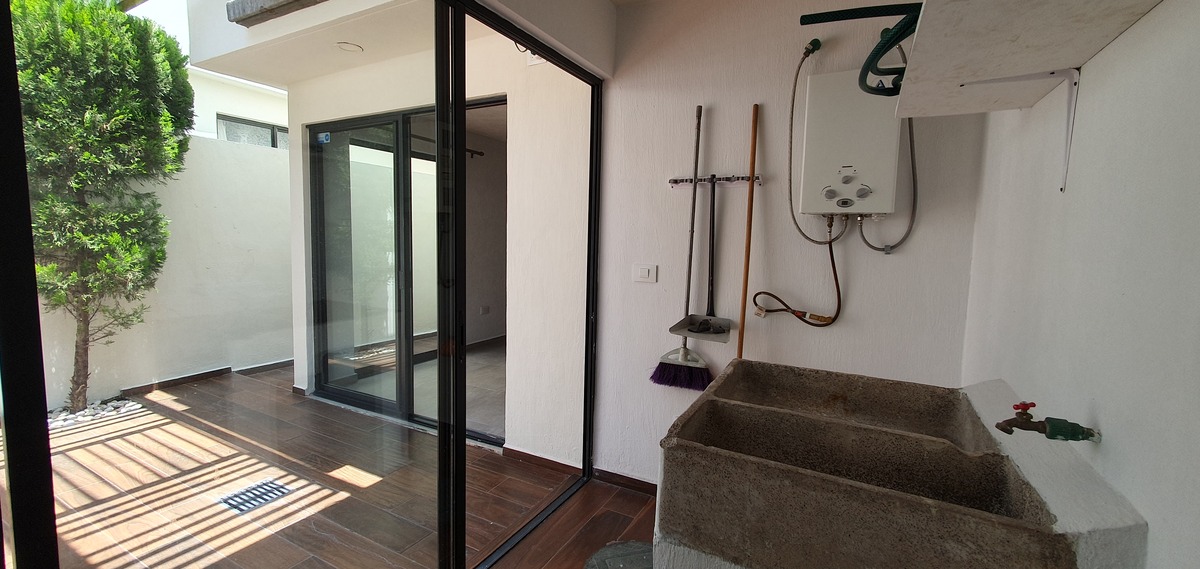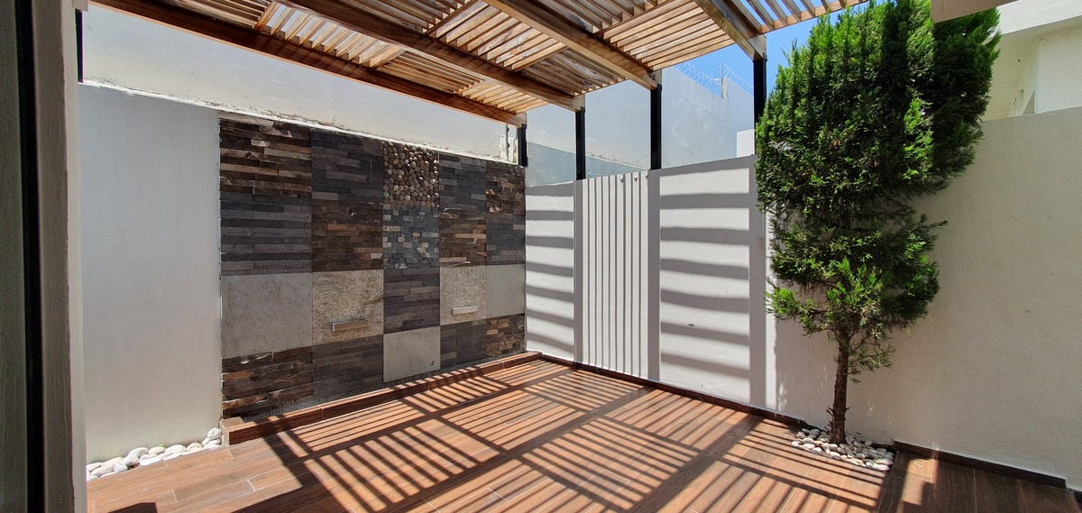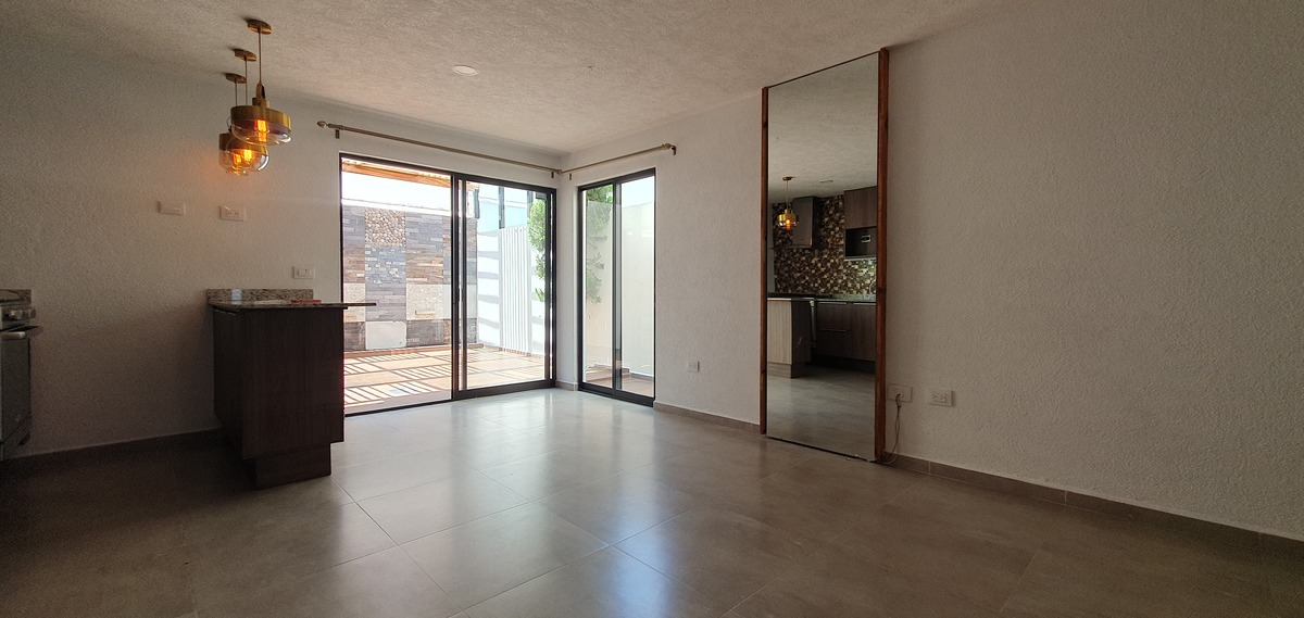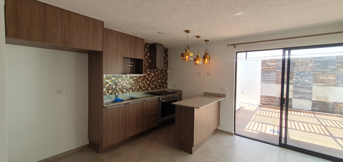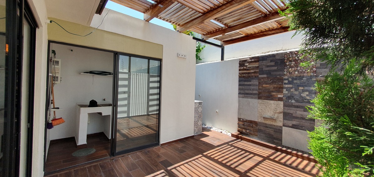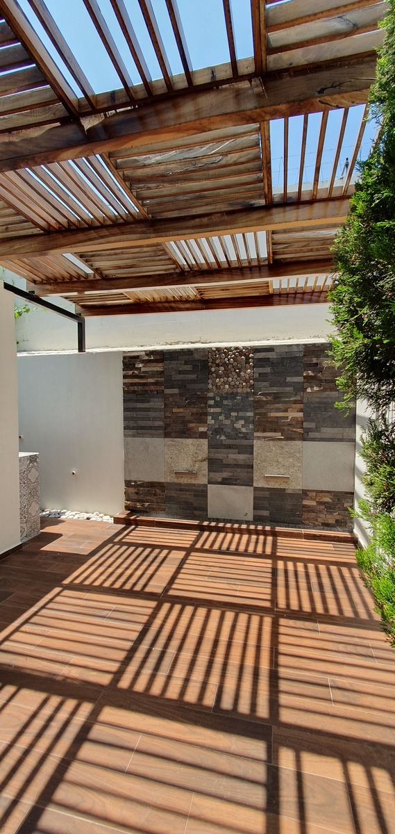 Plata baja: espacio sala comedor | medio baño | cocina integral con barra de granito y lámparas colgantes | área de lavado techado e independiente | terraza con pérgola, muro llorón y área con asador | servidumbre lateral | 2 espacios para estacionamiento | cisterna, tanque estacionario y protección de herrería en puerta principal.