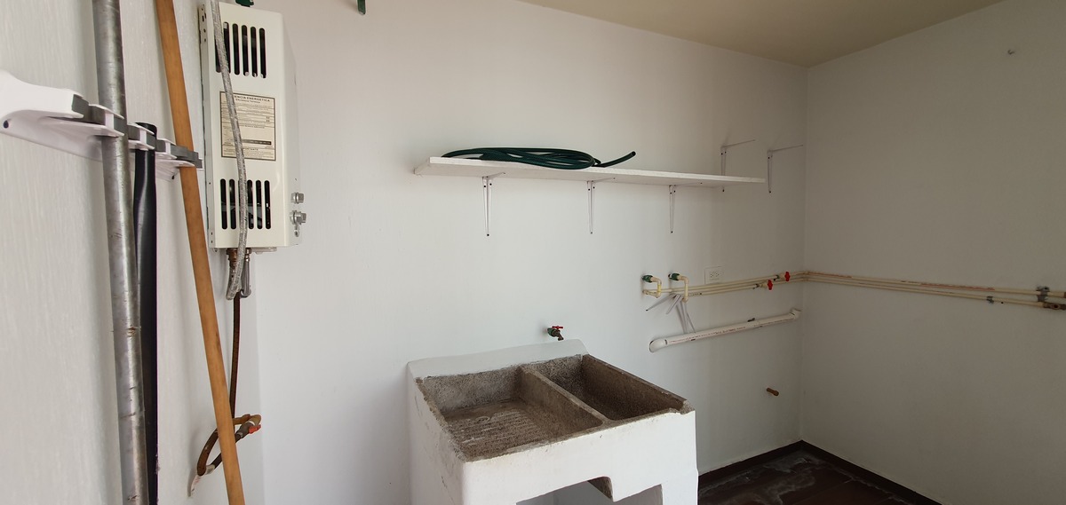 Ground floor: living-dining room space | half bathroom | integral kitchen with granite bar and hanging lamps | covered and independent laundry area | terrace with pergola, waterfall wall, and barbecue area | side easement | 2 parking spaces | cistern, stationary tank, and wrought iron protection on the main door.