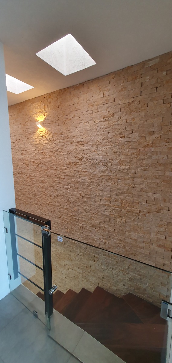 Upper floor: staircase with tempered glass railing and security door for children | distributor | master bedroom and secondary bedroom with blinds, each with a walk-in closet and full bathroom with tempered glass enclosure.