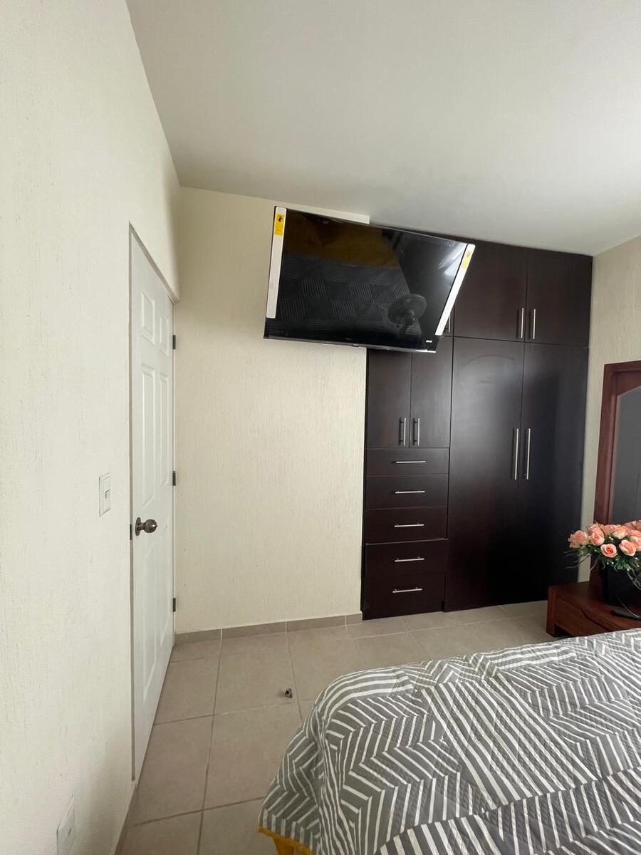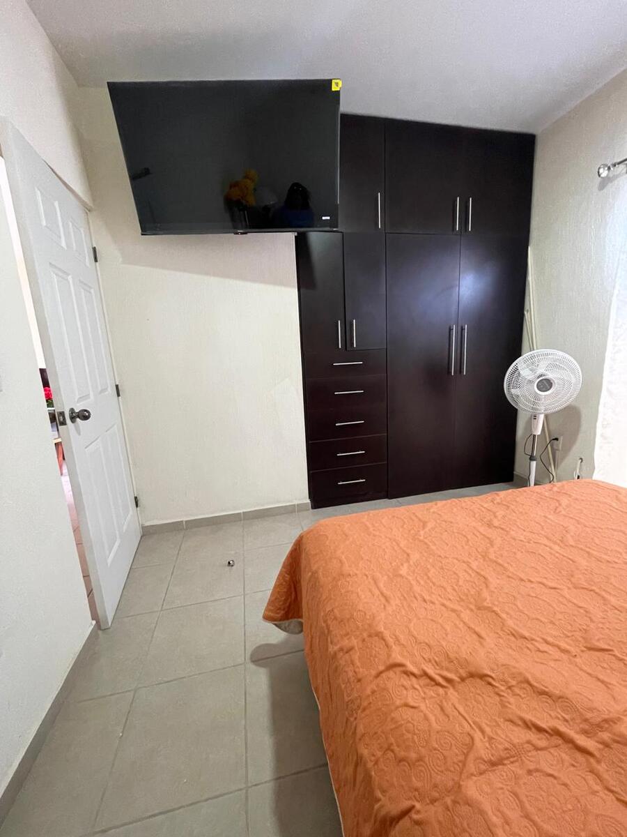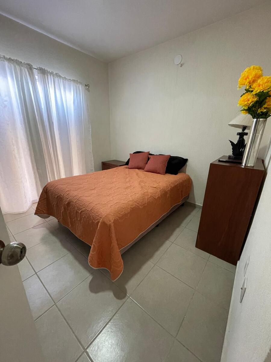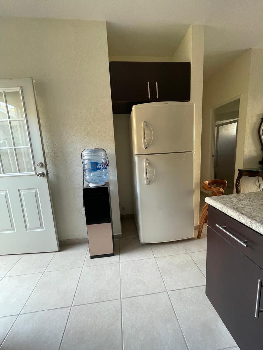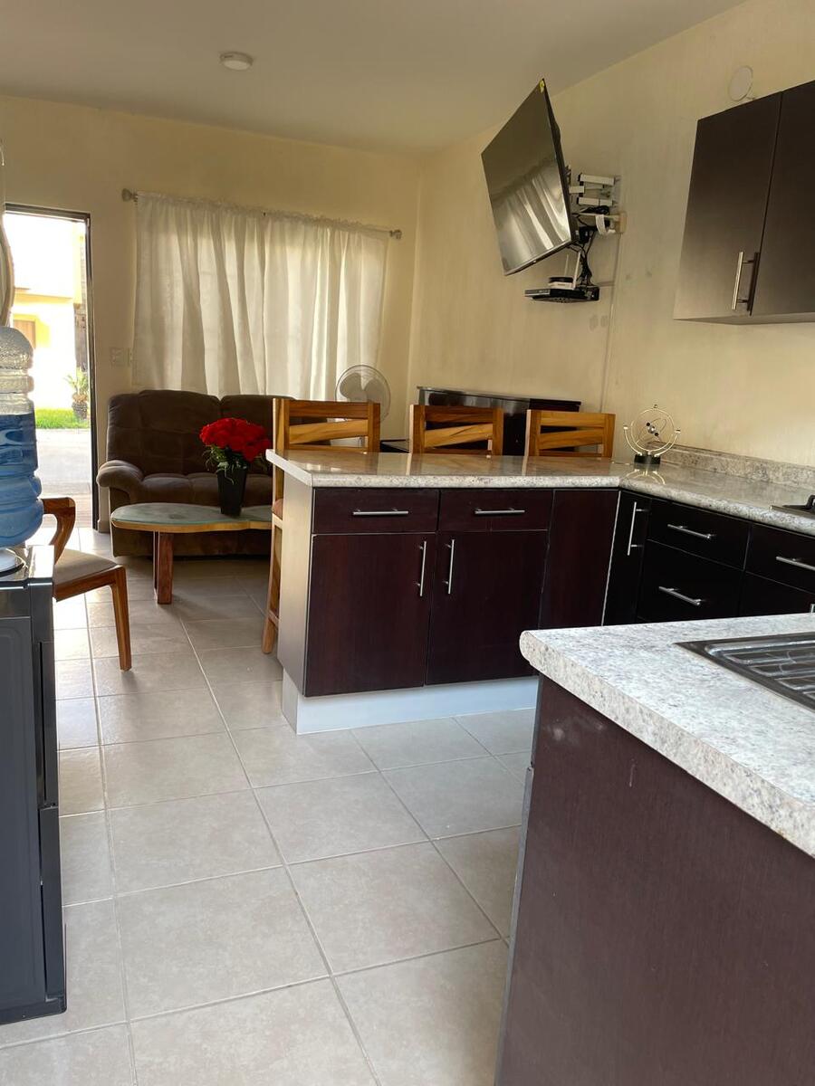 Cochera para 2 autos, Espacio de sala, cocina integral con barra desayunadora, aire acondicionado, una recamara con clóset, un baño completo, amplio patio trasero con piso y pasillo lateral de servicio.