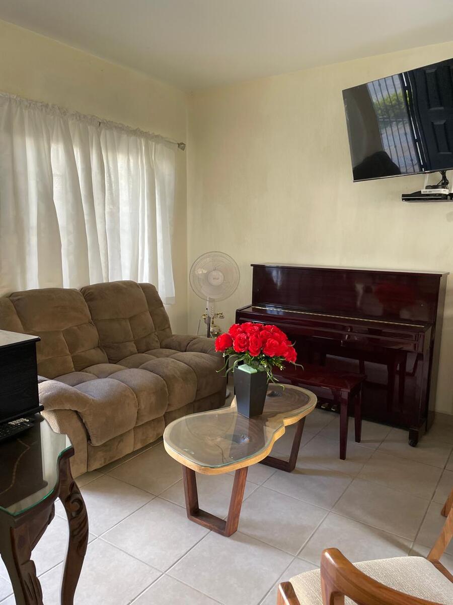 Garage for 2 cars, living room space, integral kitchen with breakfast bar, air conditioning, one bedroom with closet, one full bathroom, large backyard with flooring and side service corridor.