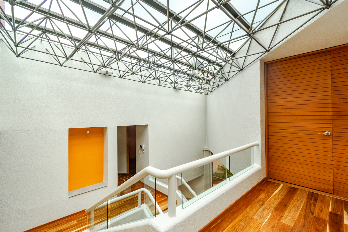 Sala a doble altura con chimenea con tiro y vista al jardín.