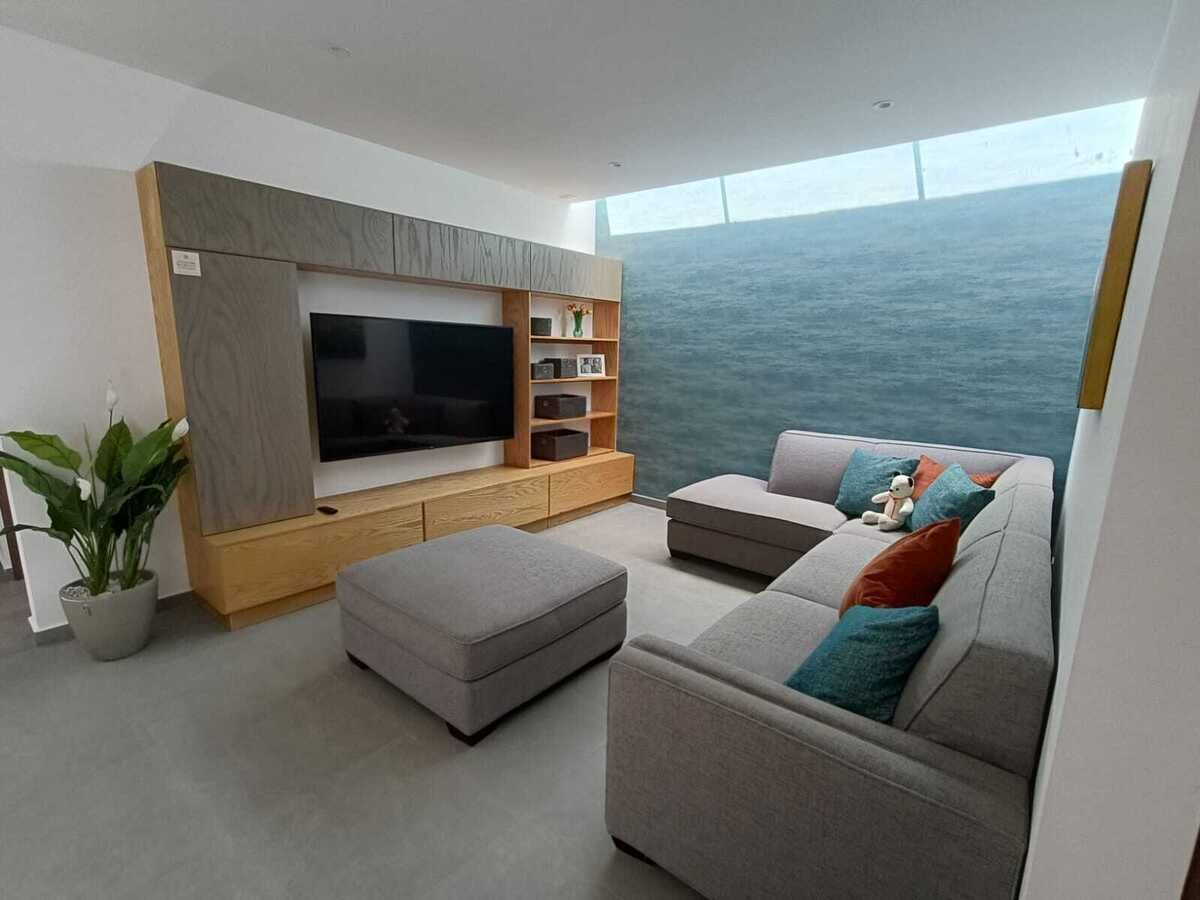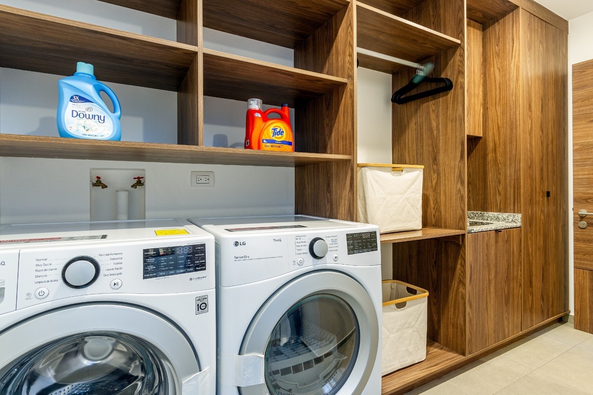 Las habitaciones están separadas por un estudio o sala de televisión y el área de lavado y blancos.