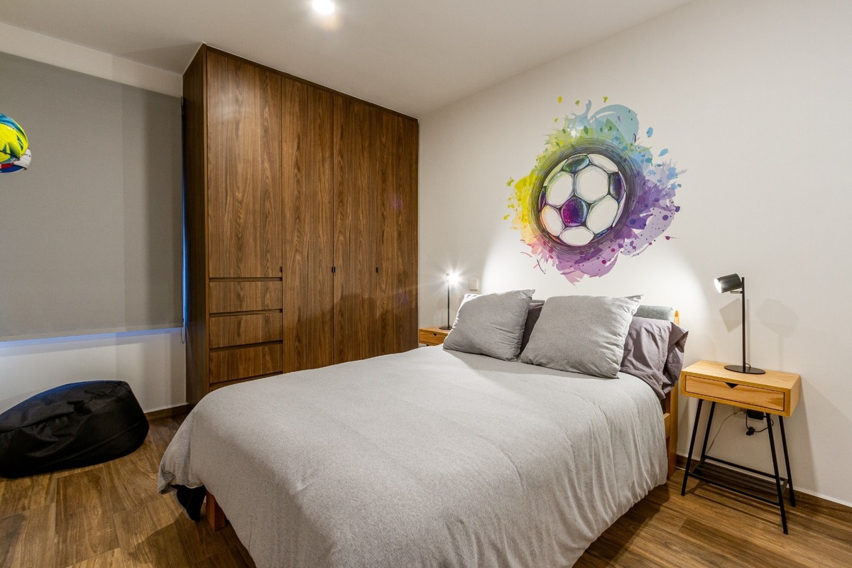 A detailed stone wall with indirect lights adorns the stairs leading to the second level where we can find 3 bedrooms, each with its own bathroom. The master bedroom has a walk-in closet.