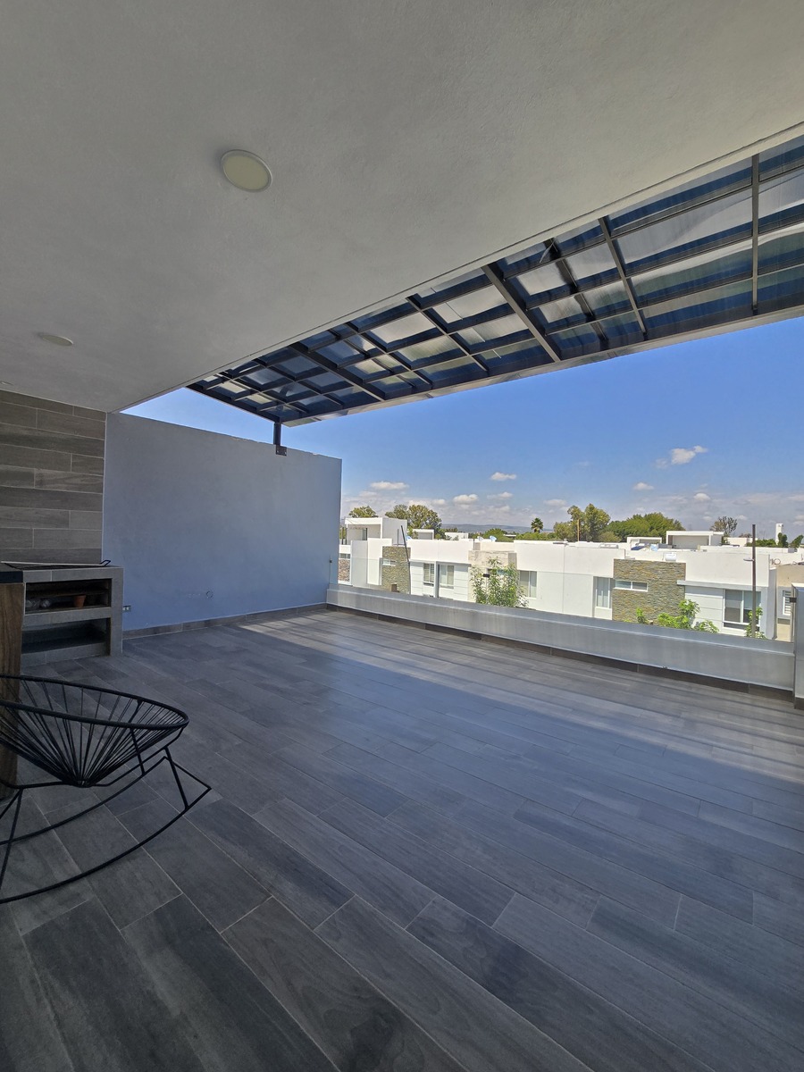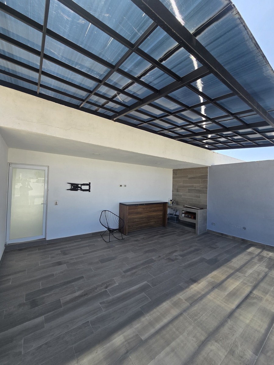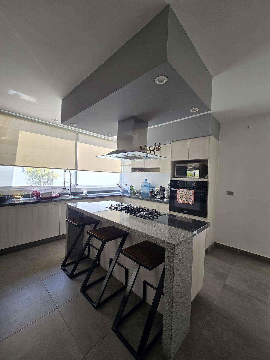 Se ofrece a la venta una residencia excepcional en Cavalia, Aguascalientes, ubicada al Norponiente. La propiedad cuenta con estacionamiento techado para dos vehículos, una cocina espaciosa con barra de granito, un patio de servicio, y un jardín. Adicionalmente, dispone de una recámara de servicio con baño completo. En la planta alta, se encuentran cuatro recámaras; tres de ellas secundarias comparten un baño completo, mientras que la recámara principal incluye vestidor y baño completo. El tercer nivel ofrece un área de servicio y Un Roof garden