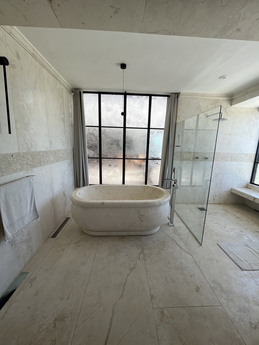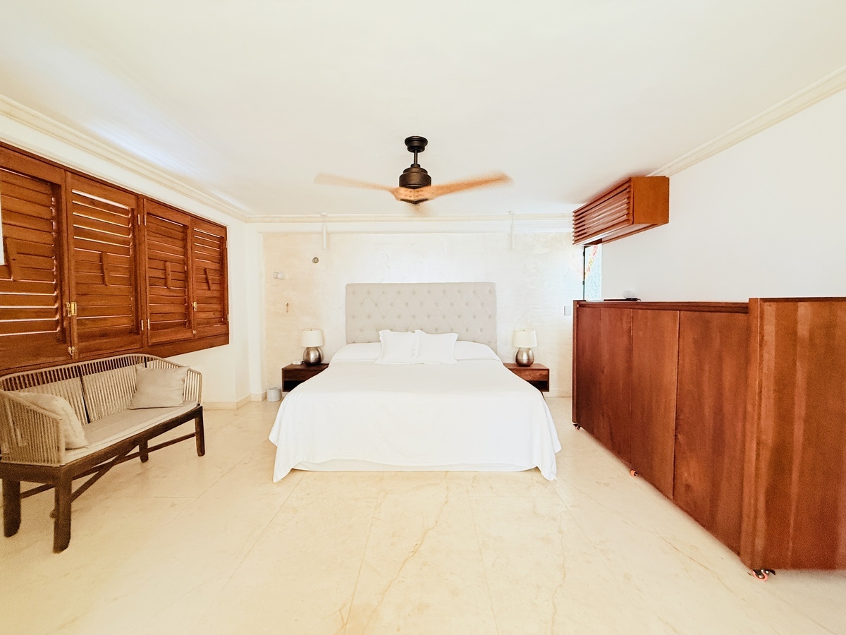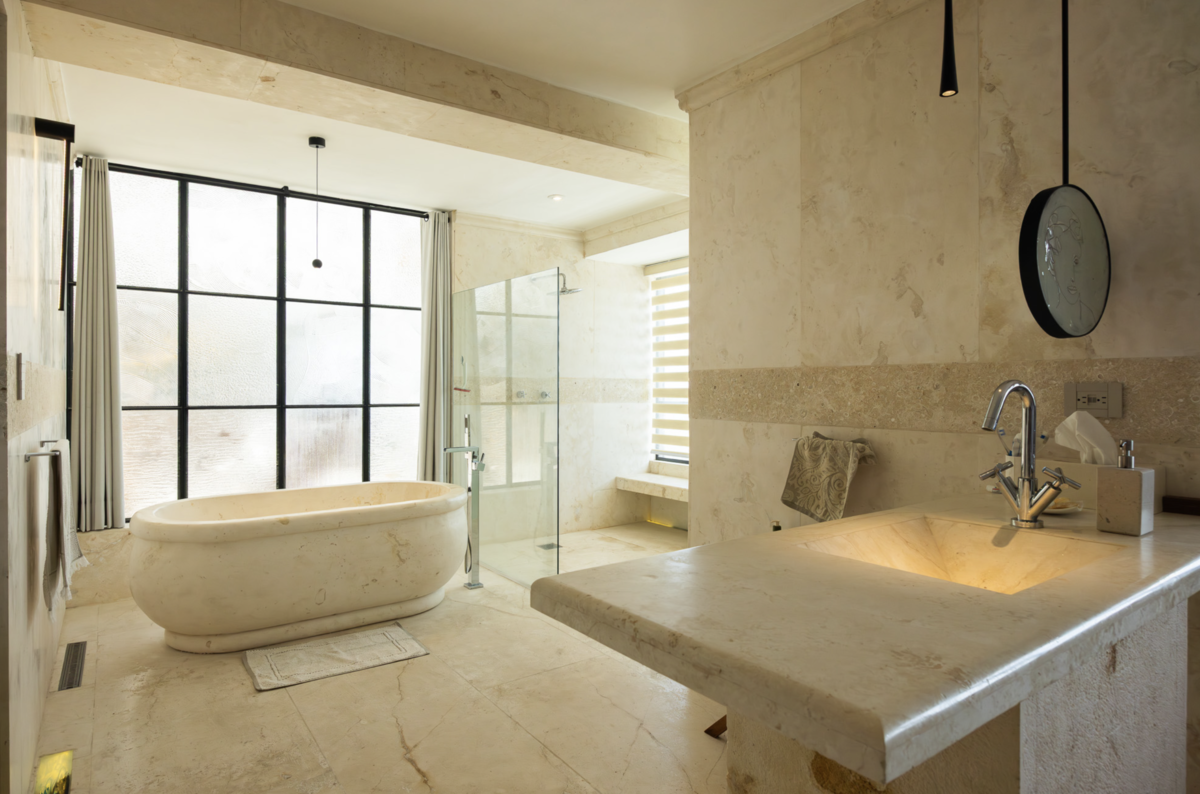 - Habitación principal con baño completo y jacuzzi de una pieza de piedra crema maya.