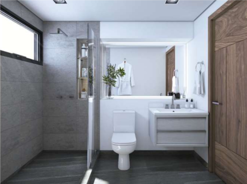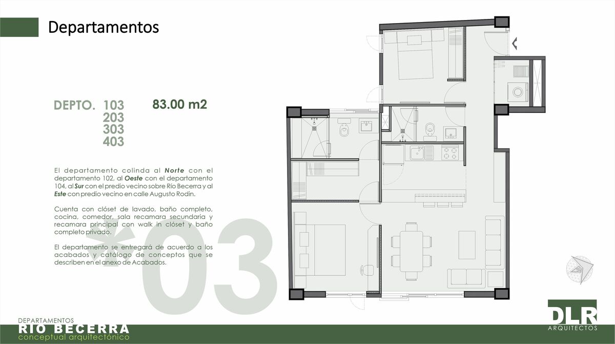 DEPARTAMENTO TIPO 3 ( 83 M2 ): CONSTA DE SALA COMEDOR, COCINA INTEGRAL ABIERTA, 2 RECÁMARAS, LA PRINCIPAL CON VESTIDOR Y BAÑO, RECÁMRA SECUNDARIA CON WALK-IN CLOSET Y BAÑO QUE COMPARTE CON VISITAS Y ÁREA DE LAVADO.