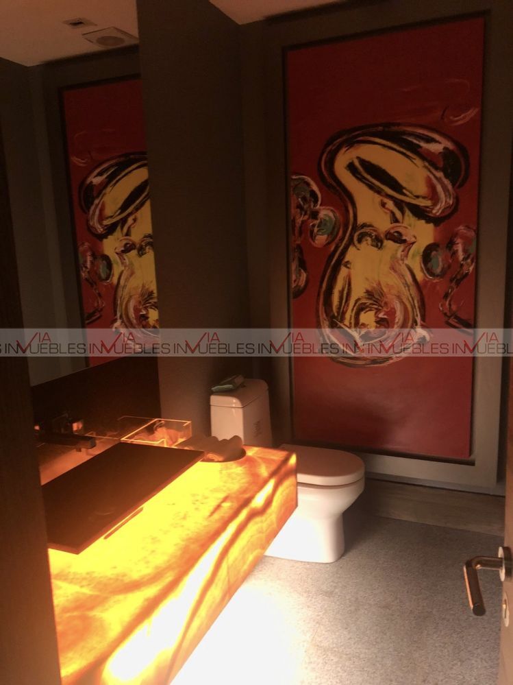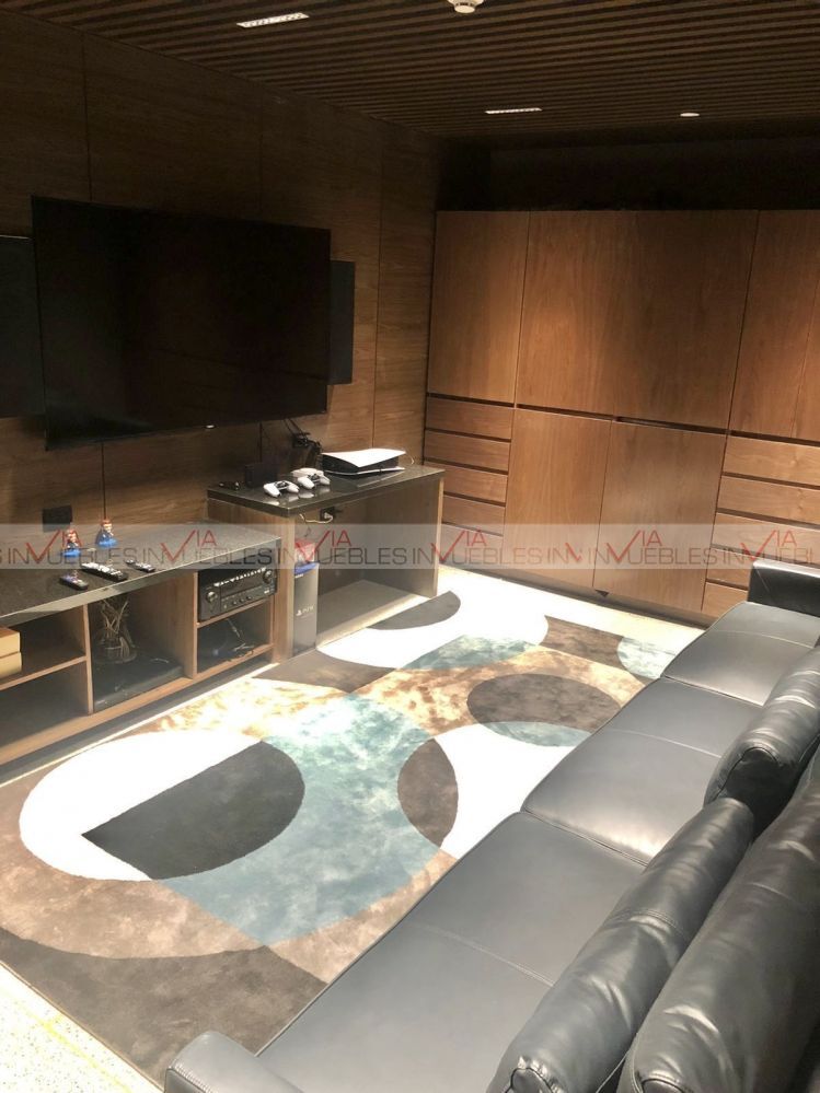 El baño de visitas posee una cubierta de onyx que se ilumina, acentuando los tonos y elegancia de ese material. El área social es muy amplia y cuenta con plafones de madera, así como muebles empotrados y una cava de vinos.