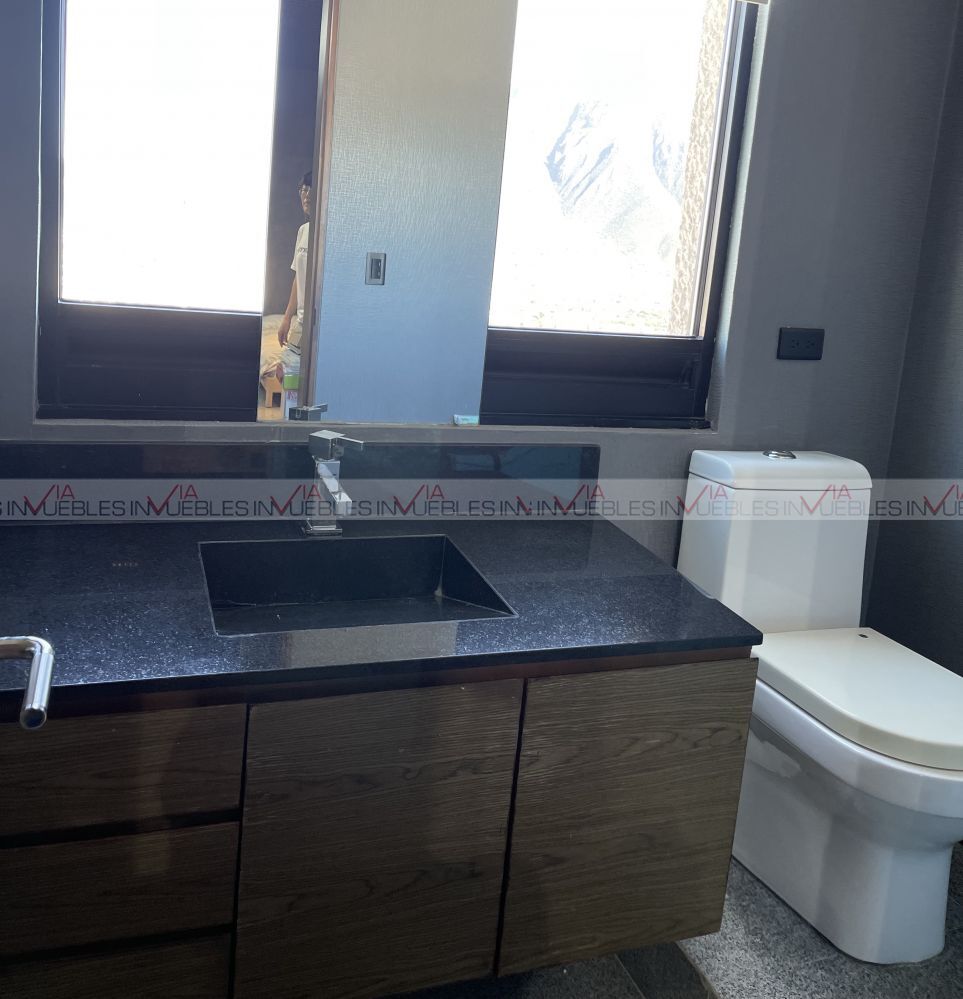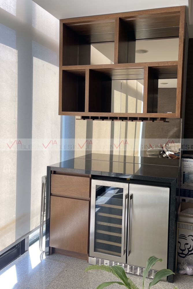 El baño de visitas posee una cubierta de onyx que se ilumina, acentuando los tonos y elegancia de ese material. El área social es muy amplia y cuenta con plafones de madera, así como muebles empotrados y una cava de vinos.