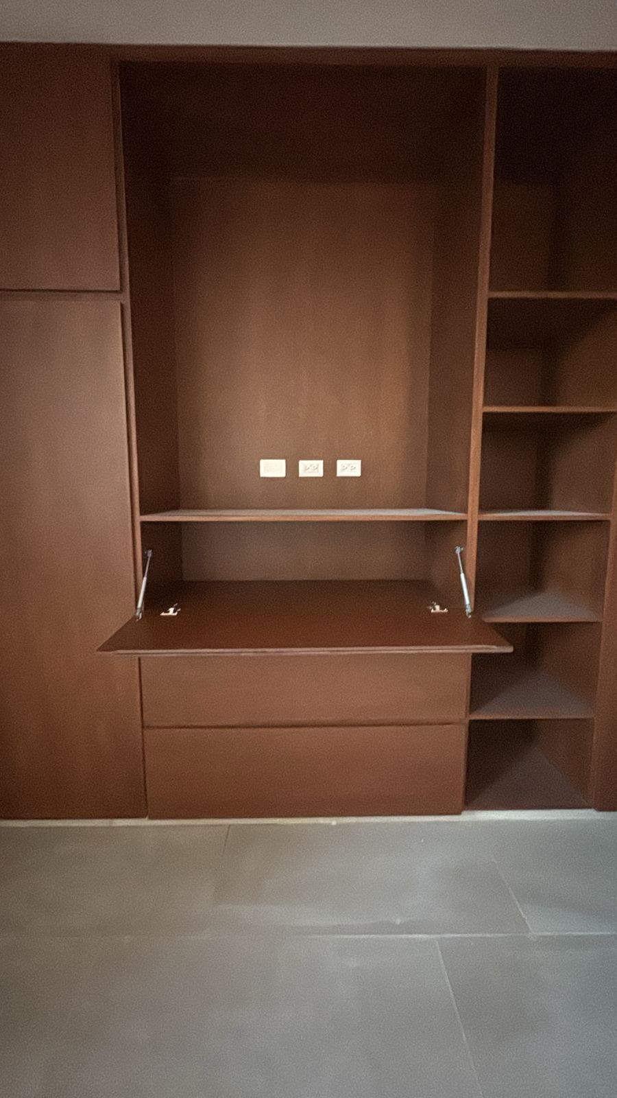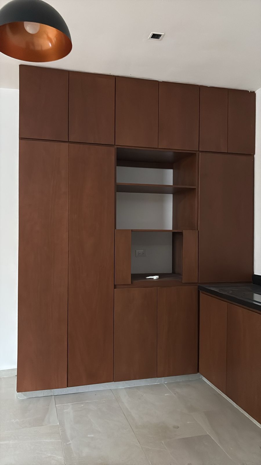 - Cocina con parrilla eléctrica, granito y gaveteras inferiores de madera.