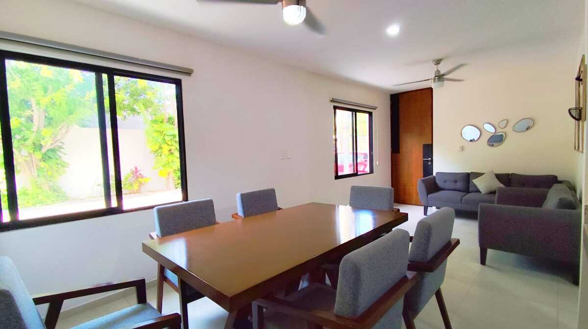 Estancia con sala y comedor de seis sillas, aire acondicionado y ventilador de techo.