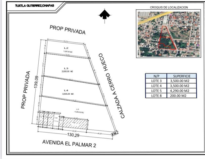 El terreno (Lote 5) se encuentra en esquina, consta de 4,290 metros cuadrados, con un frente de 44.07 metros sobre la Calzada a Cerro Hueco.