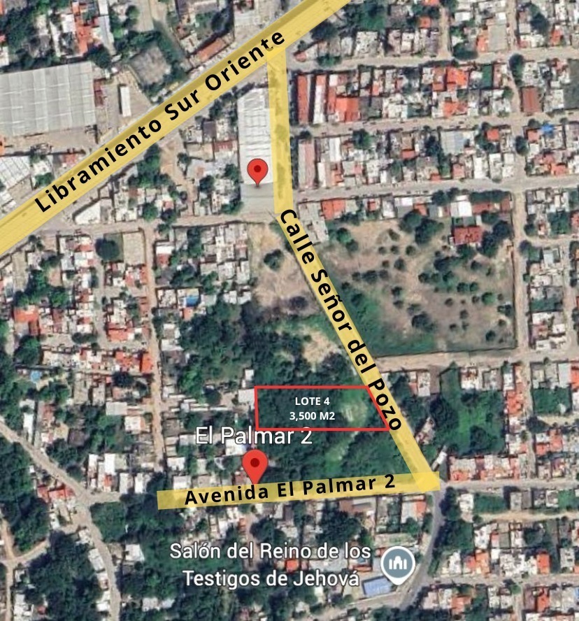 El terreno (Lote 4) consta de 3,500 metros cuadrados, con un frente de 37.59 metros sobre la Calzada a Cerro Hueco.
